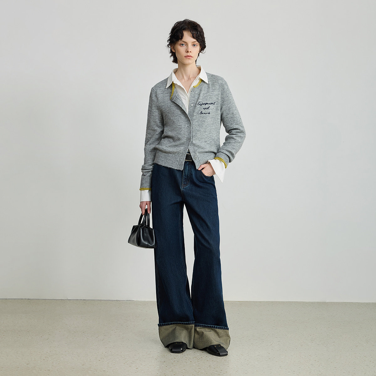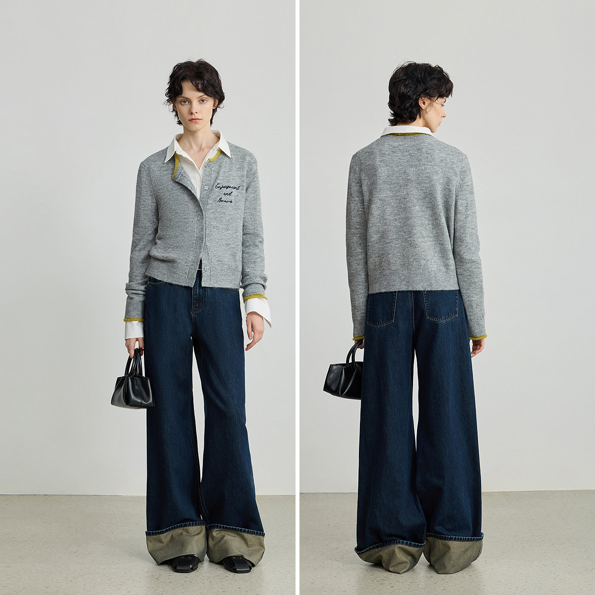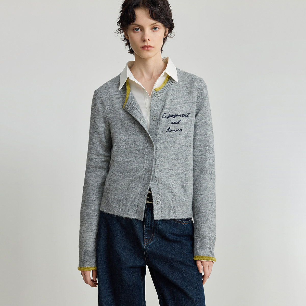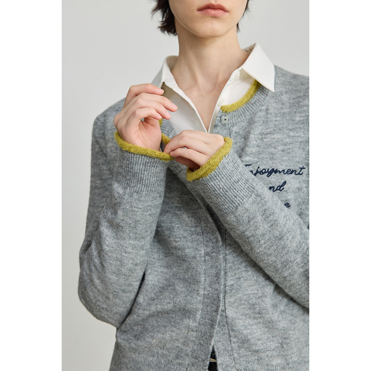 【商场同款】LILY2025秋新款含羊毛格雷系撞色圆领灰色针织开衫女