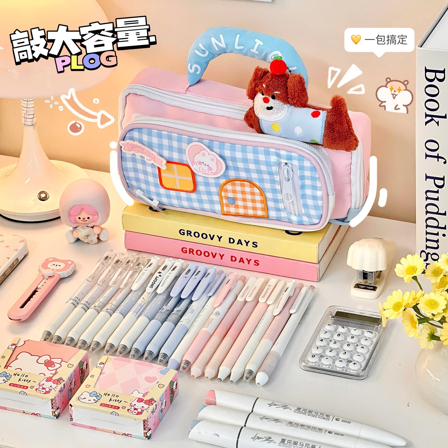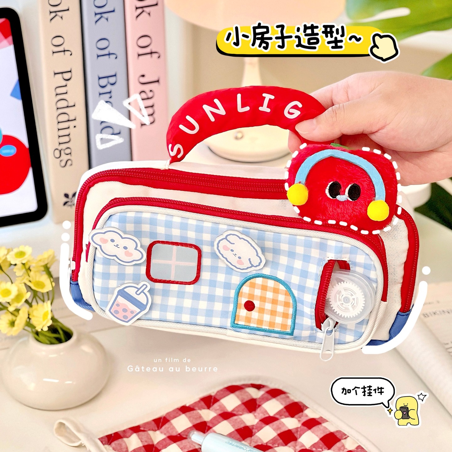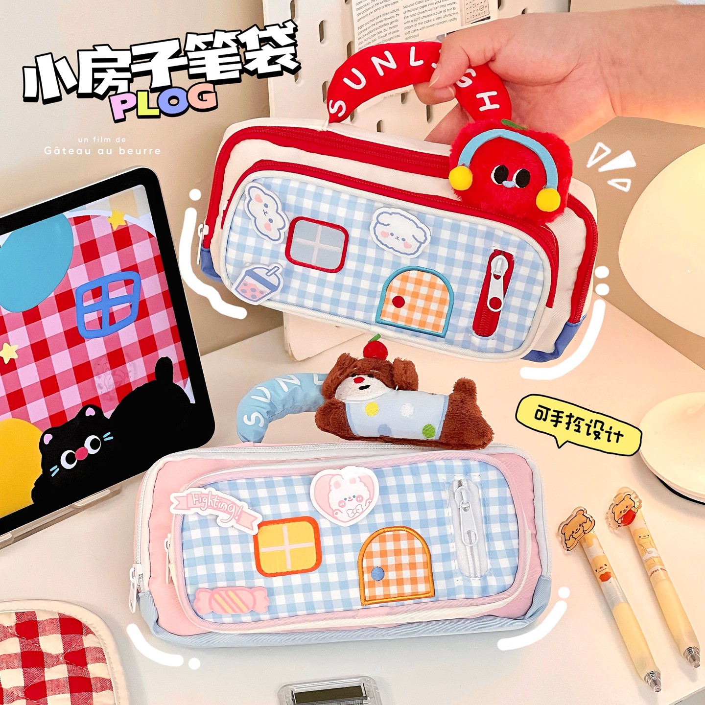 双层大容量笔袋文具收纳包可爱红色小学生初中生铅笔盒手提包女生