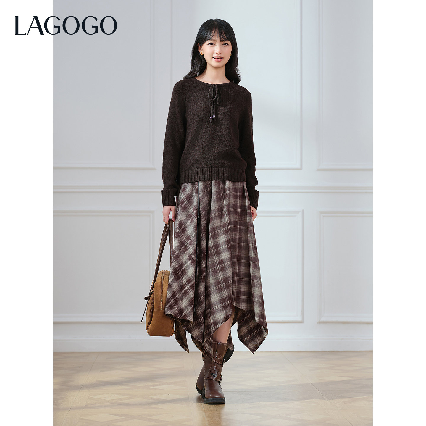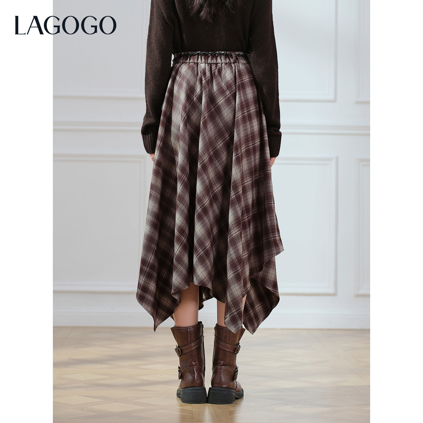 LAGOGO艺术系女孩不规则格纹半身裙女拉谷谷2025冬季新款咖色裙子