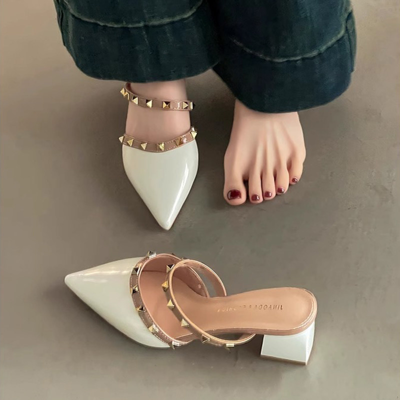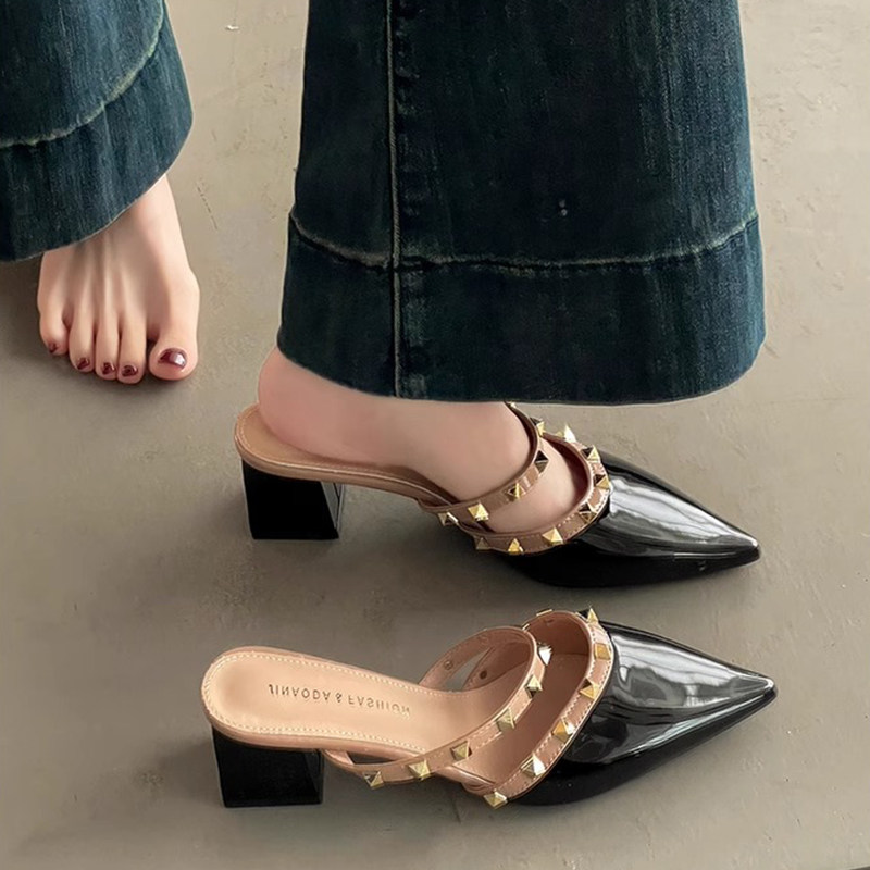 包头尖头凉拖鞋女2025春夏季新款外穿粗跟拖鞋气质女鞋潮中跟铆钉