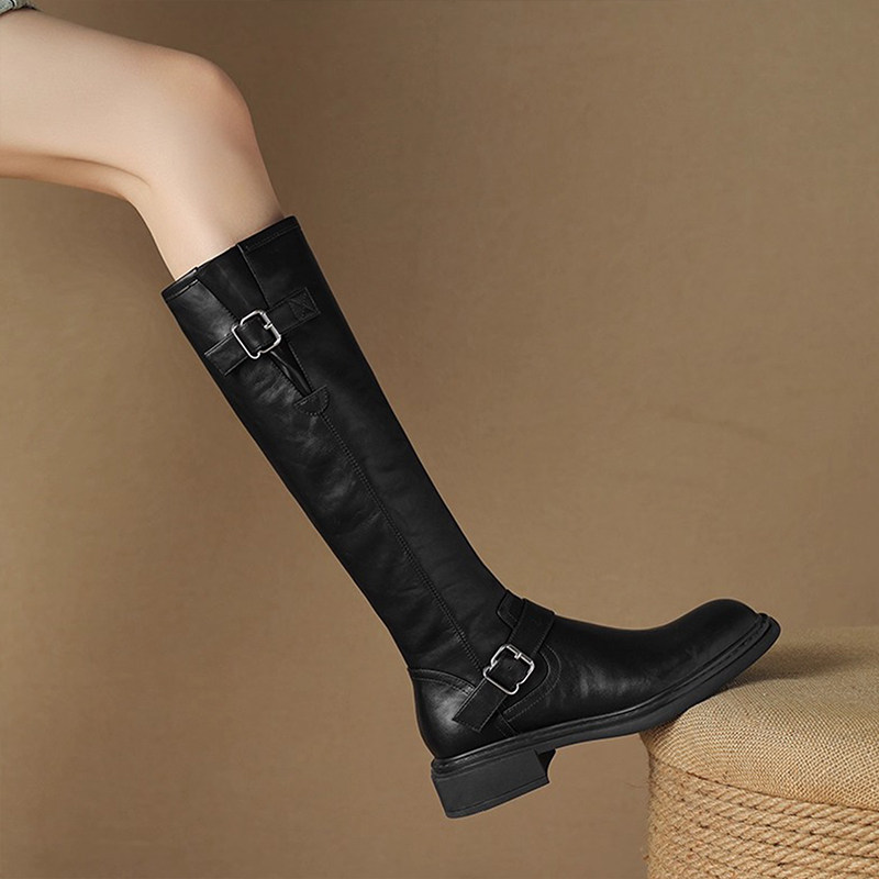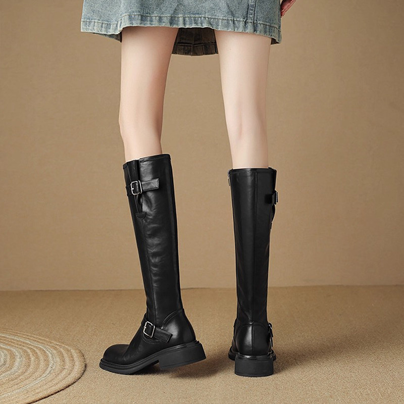 真皮~骄屿复古皮带扣粗跟长筒靴不过膝显瘦骑士靴尖头褶皱堆堆靴