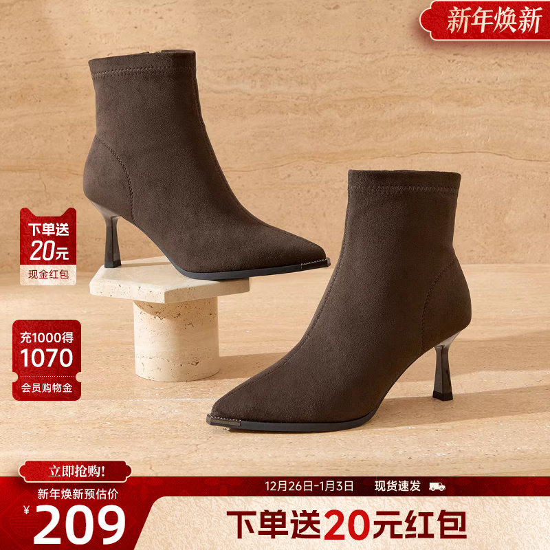 戈美其商场同款美拉德棕色靴子2025冬季新款爆款细高跟短靴马丁靴