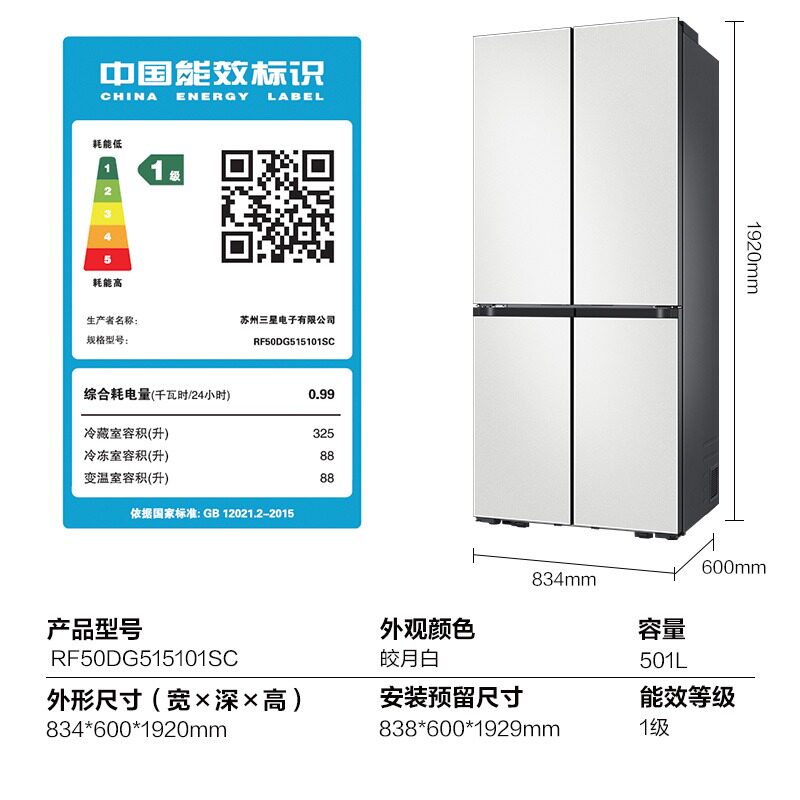 【AI神】三星501L超薄嵌入式三循环十字门家用冰箱RF50DG515101SC