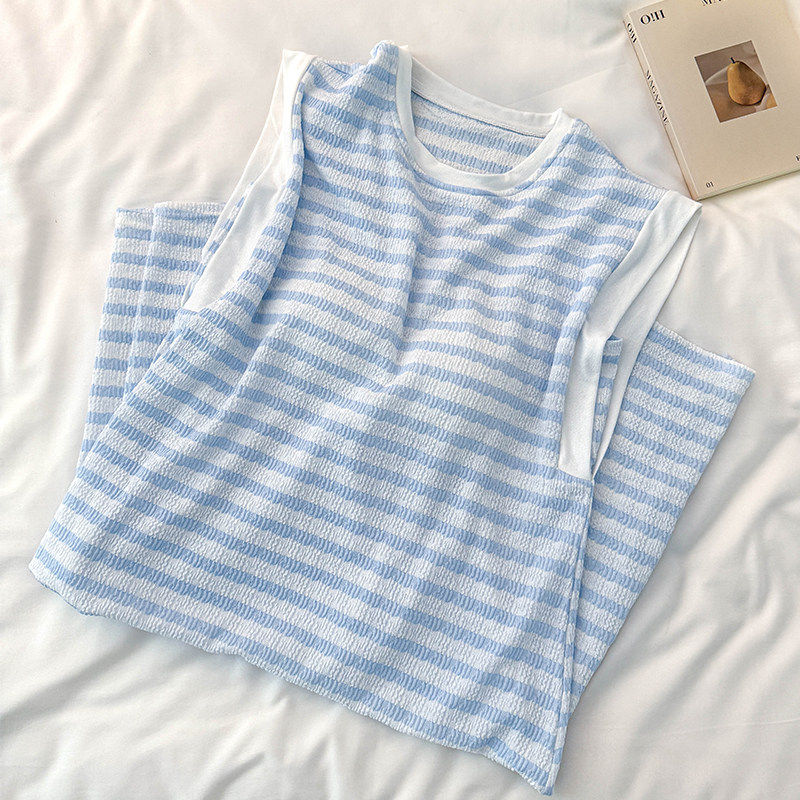 红豆莫代尔纯棉条纹睡裙女夏季圆领无袖背心带胸垫睡衣可外穿家居