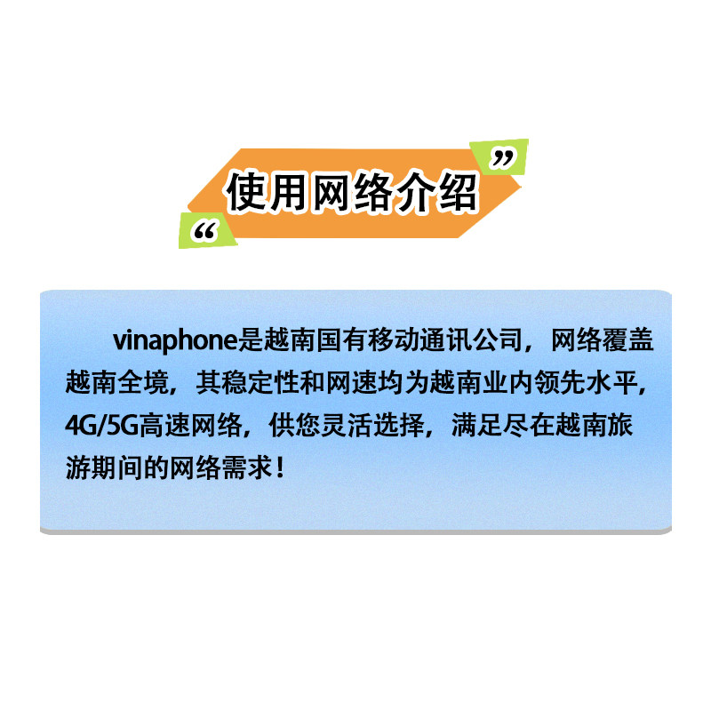 VINAPHONE5G高速网络,每日10GB高速流量,当日用完可免费续充! 支持市面主流手机,不挑机型,三合一免剪卡 商家激活,按越南当地时间自然日计算,落地插卡即用 越南全境可用,可接听电话,不支持拨打与短信功能 去领券购买 ->