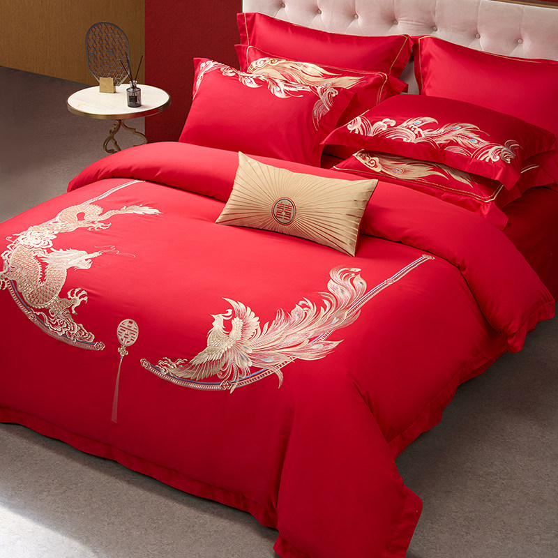 梦洁家纺婚庆四件六件套婚嫁喜被湘绣大红色喜庆被套结婚床上用品