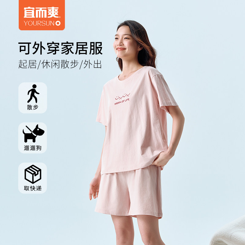 宜而爽女全棉短袖短裤女士睡衣纯棉圆领家居服套装夏季空调服
