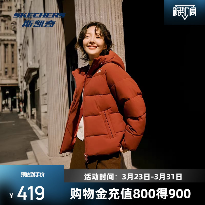 斯凯奇运动茄克冬季女款防泼水防泼油耐污舒适连帽棉服外套