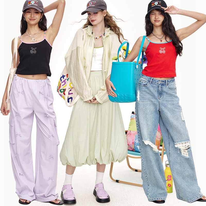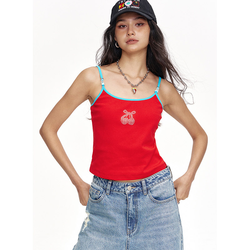 妖精的口袋重工钻珠印花白色小吊带女2025年夏季新款休闲内搭背心