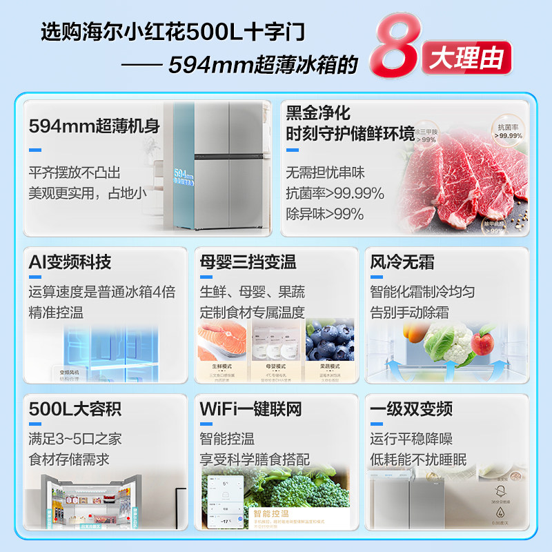 海尔冰箱小红花500L十字对开门大容量风冷一级家用电冰箱官方正品