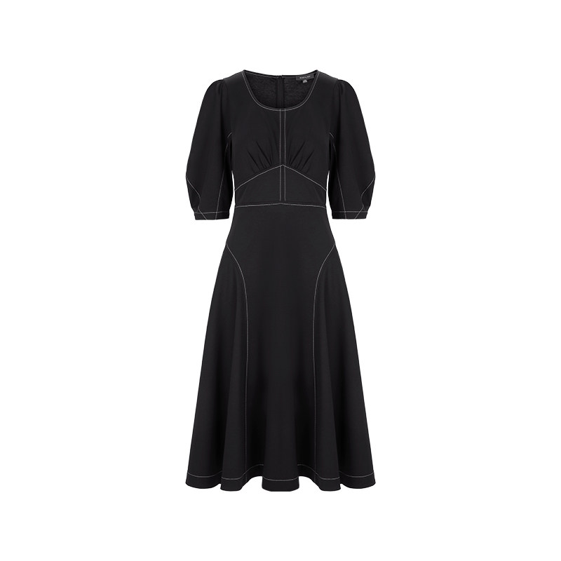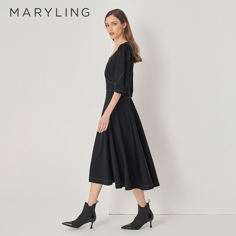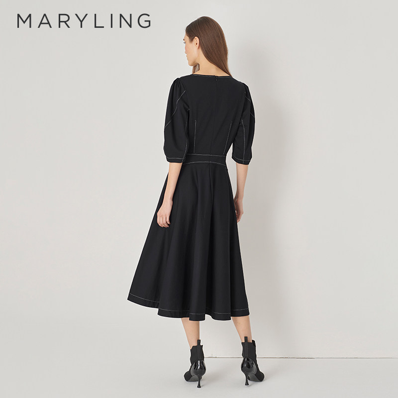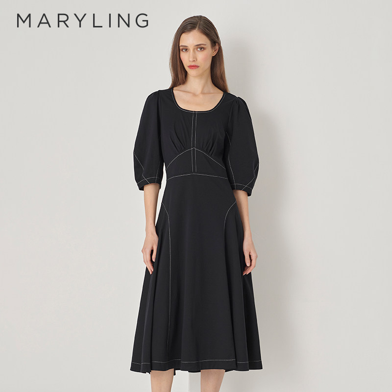 MARYLING玛俪琳初秋季新品黑白线条方领泡泡袖连衣裙A1DFW61090