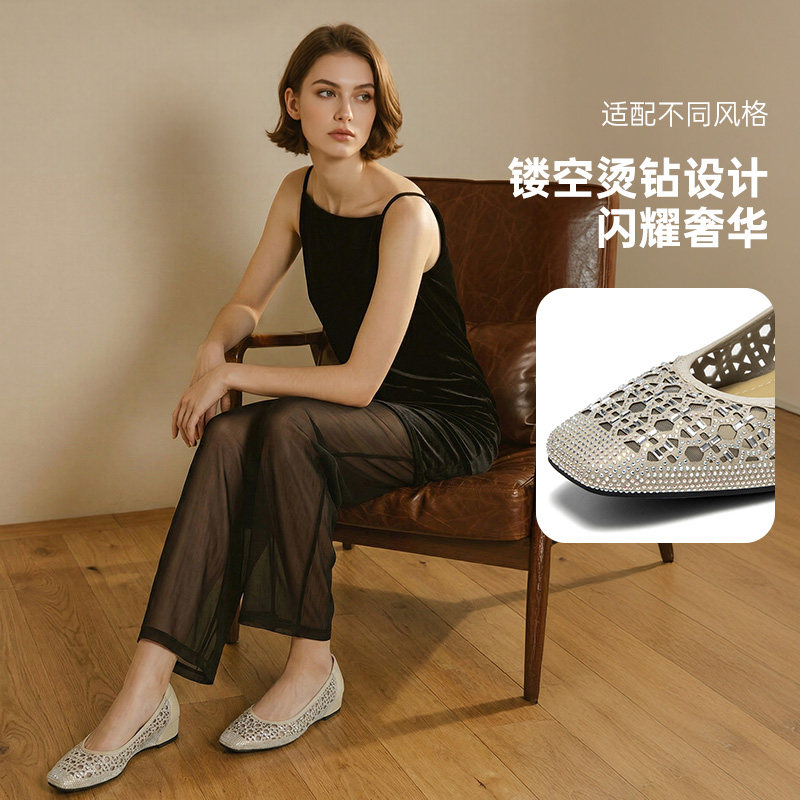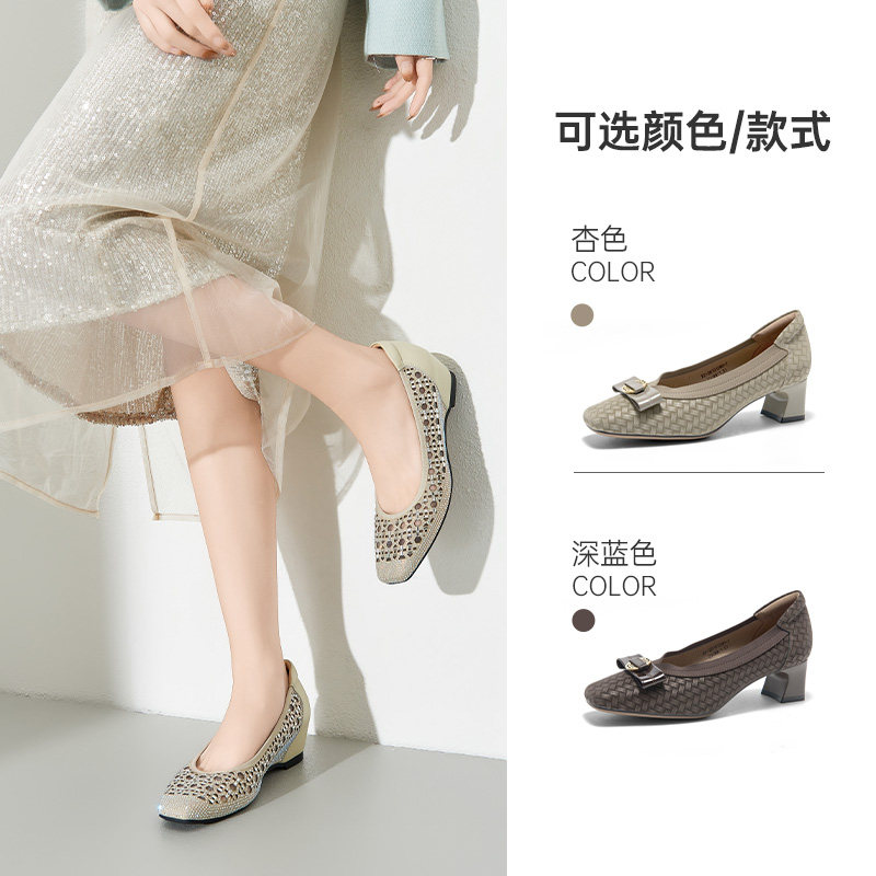 【商场同款】镂空网纱浅口单鞋女2026春季新款坡跟透气水钻妈妈鞋