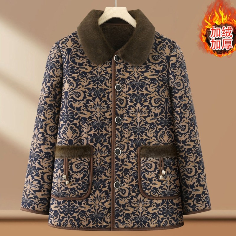 妈妈秋冬季加绒外套女中老年人大码宽松翻领棉衣三层加厚棉服上衣