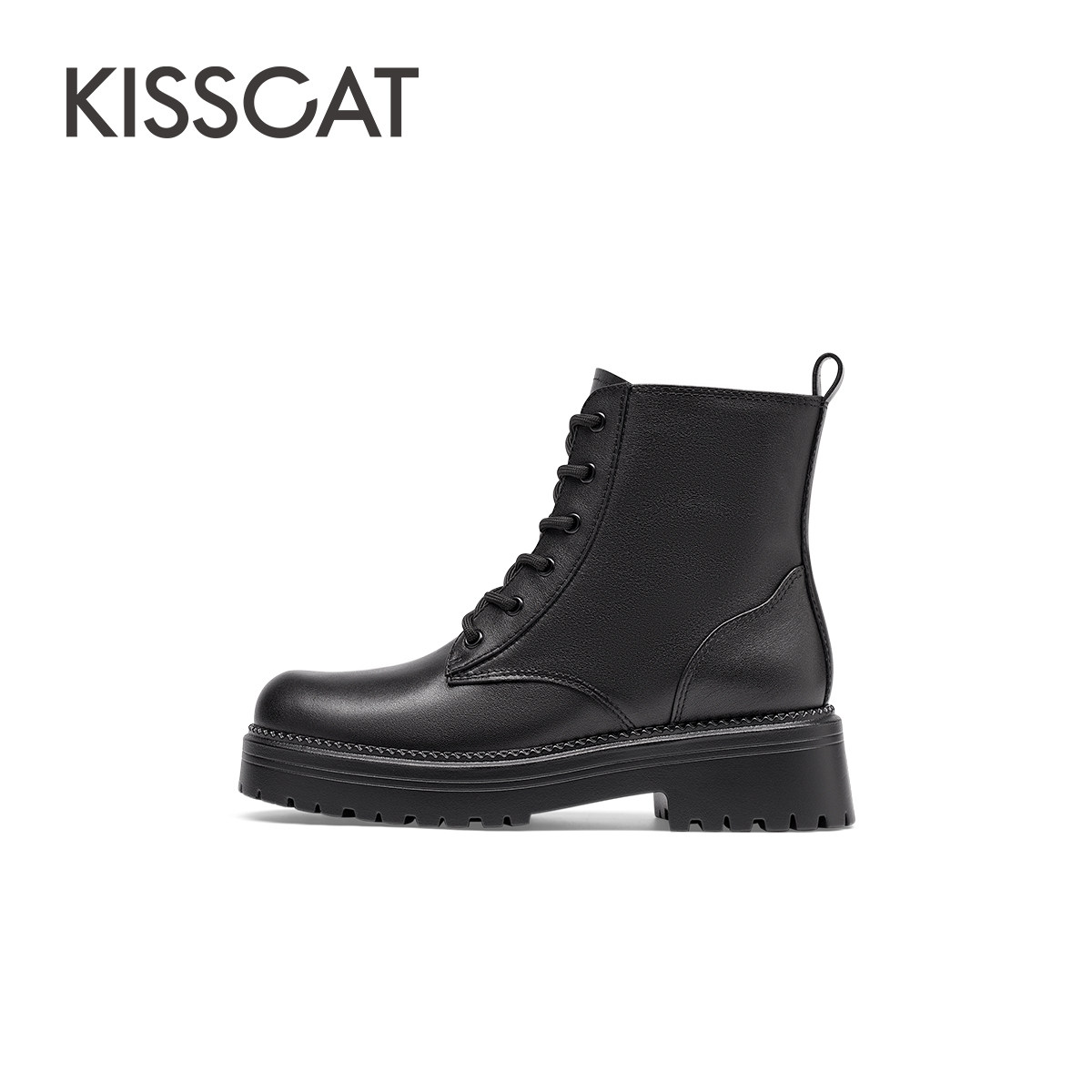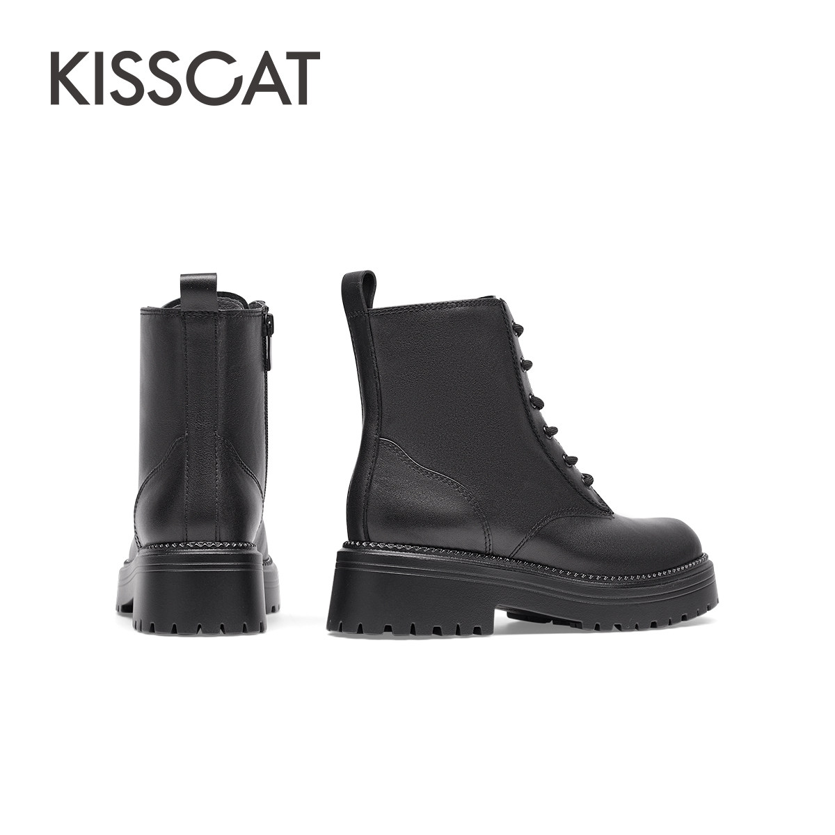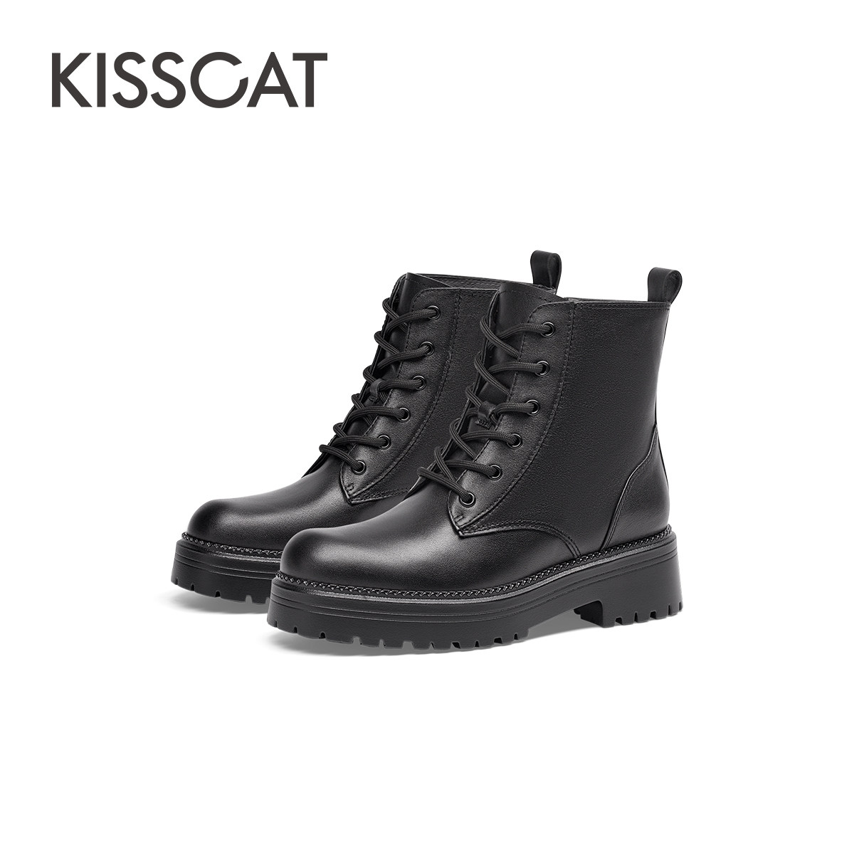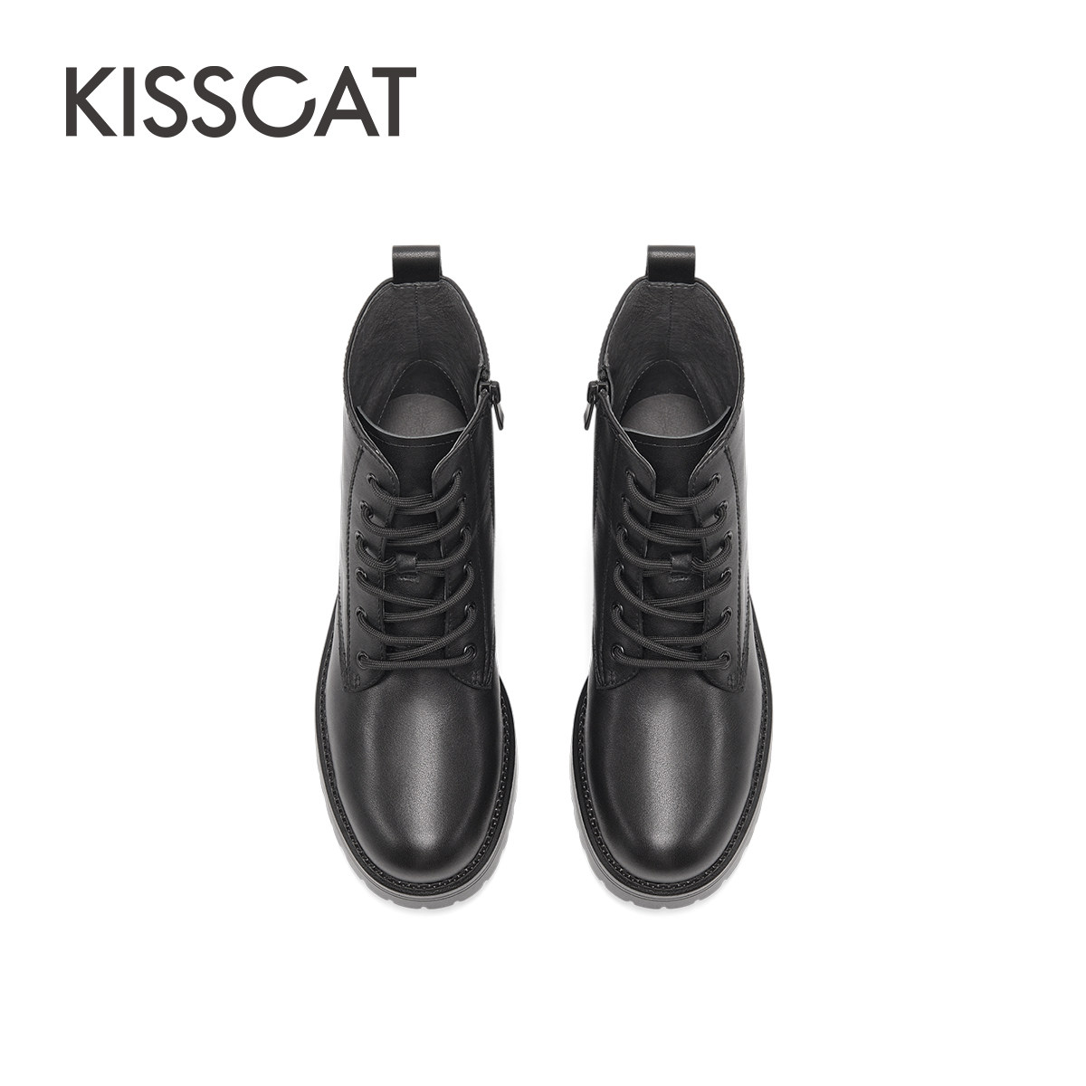KISSCAT接吻猫秋冬季新款厚底增高户外马丁靴女系带复古真皮短靴