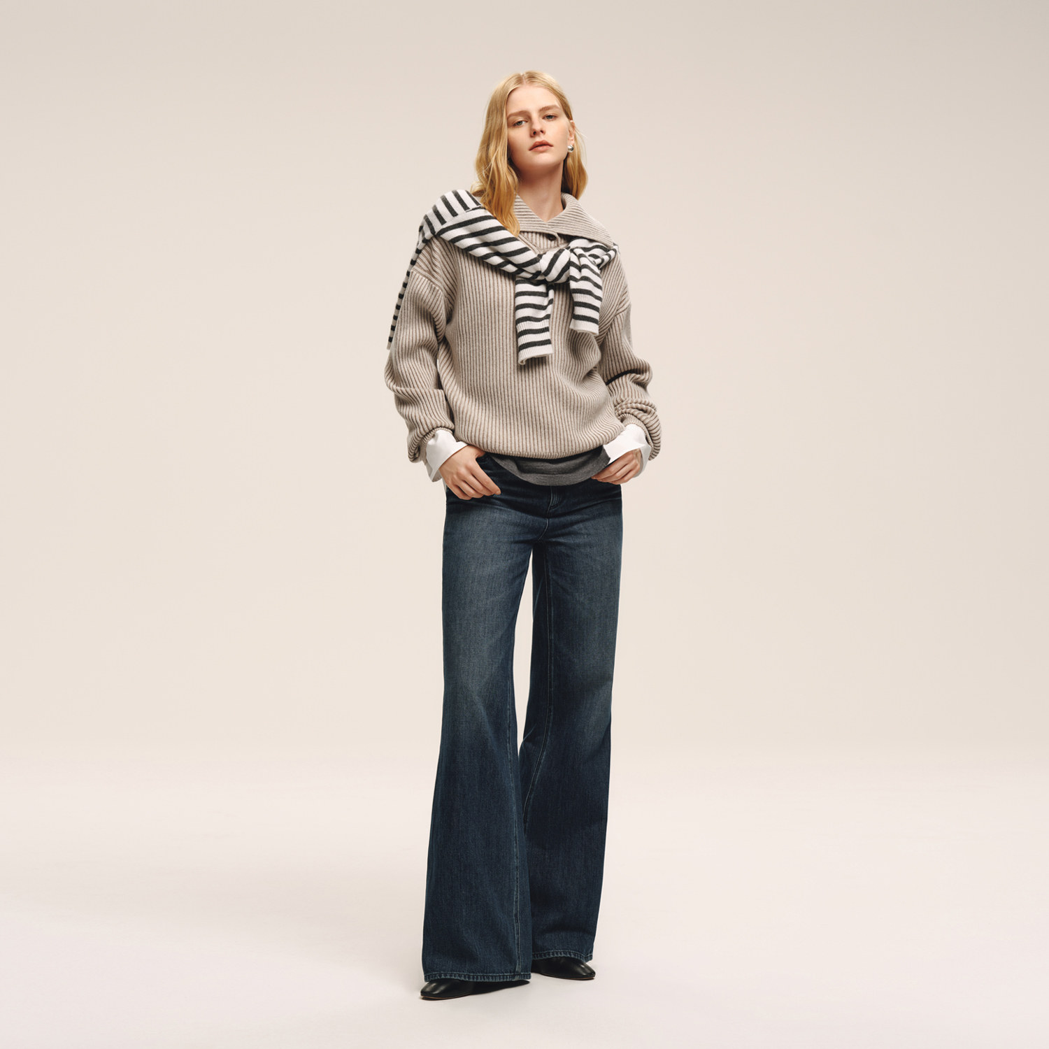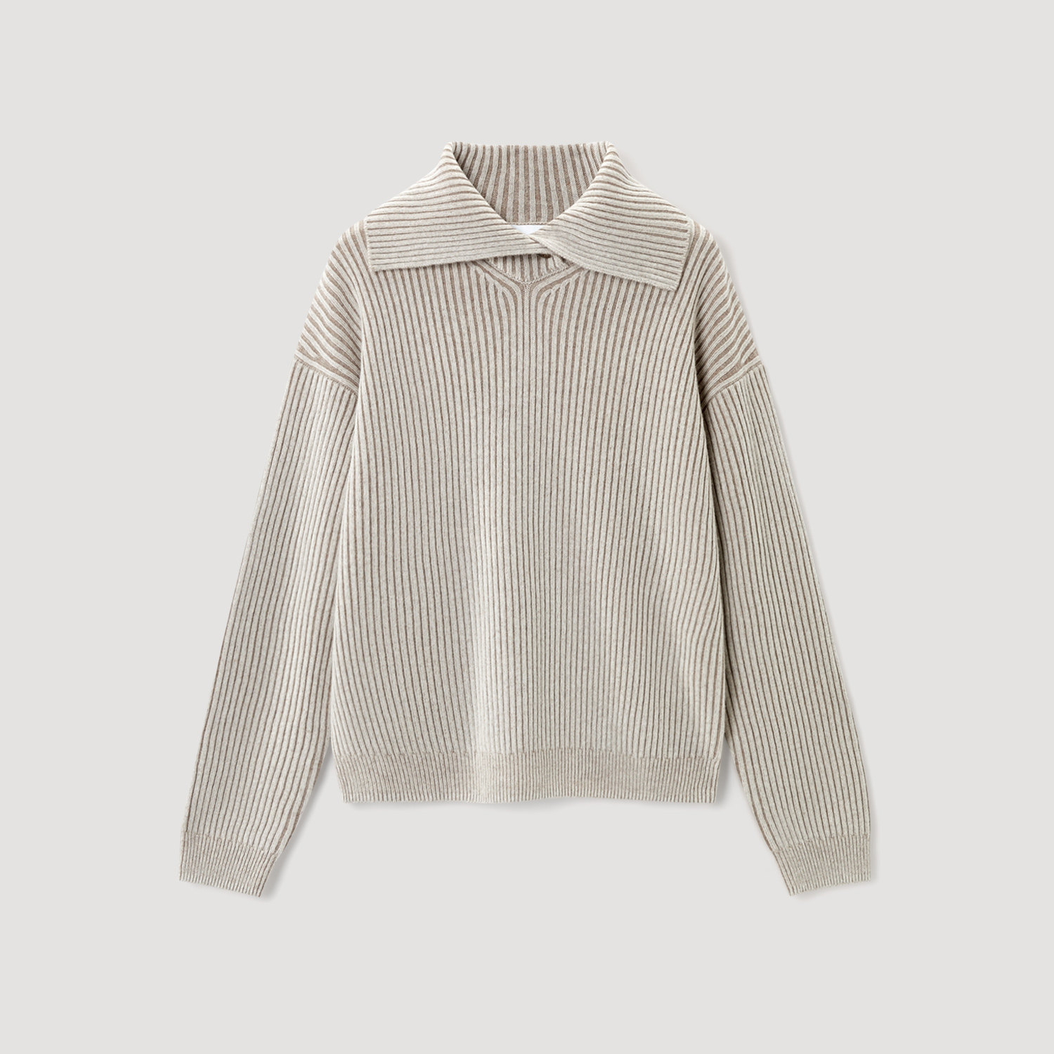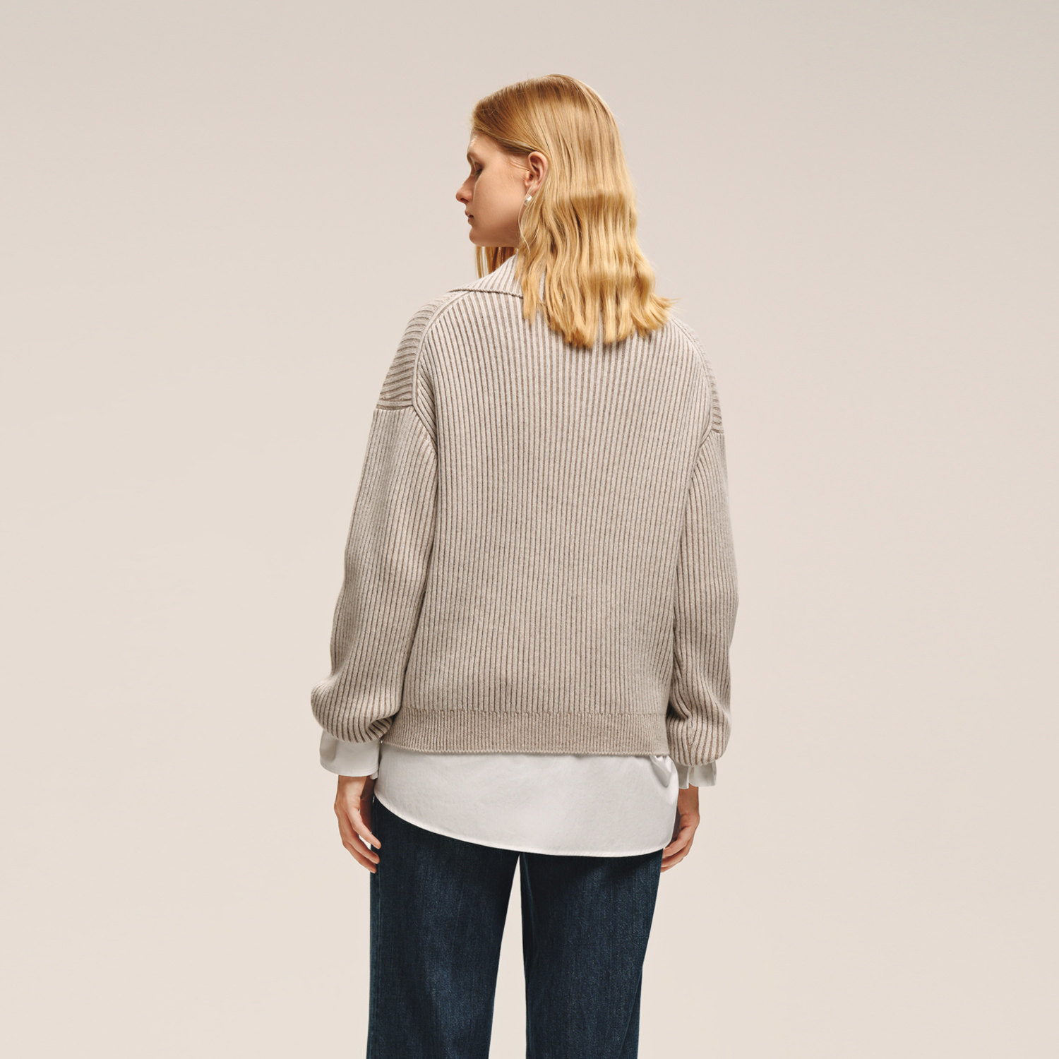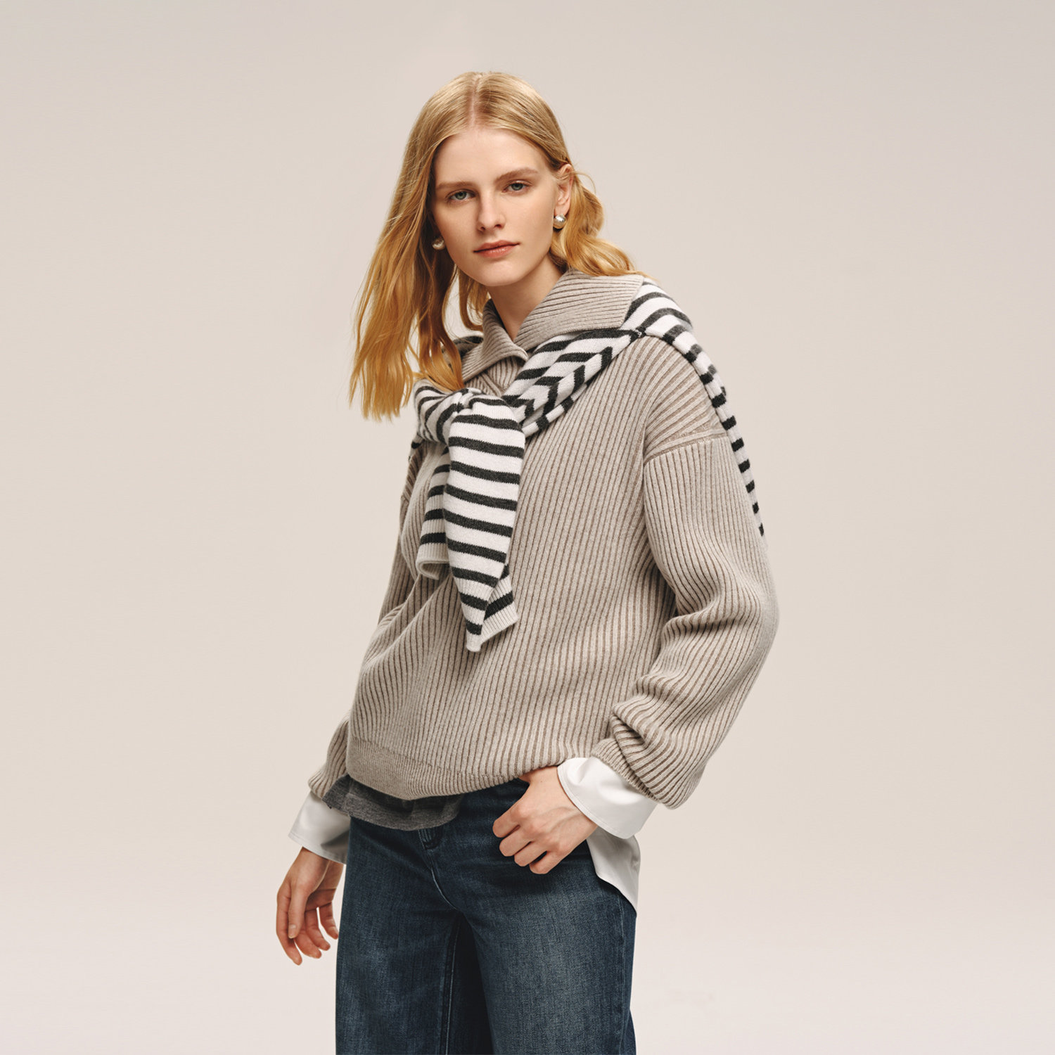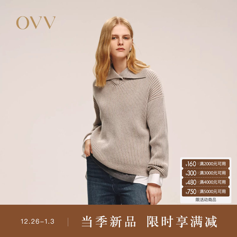 OVV2025秋冬新款女装精纺羊绒精致翻领竖坑条长袖针织衫