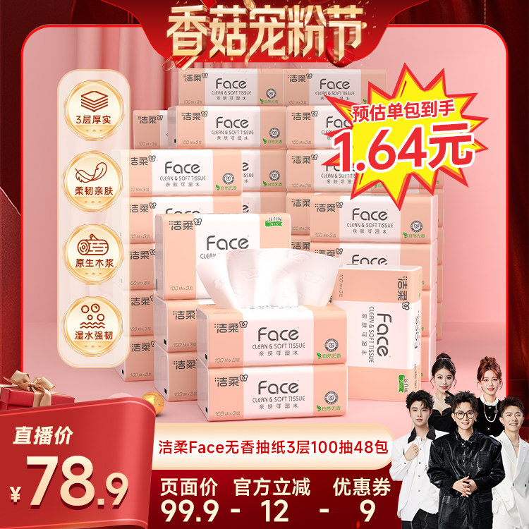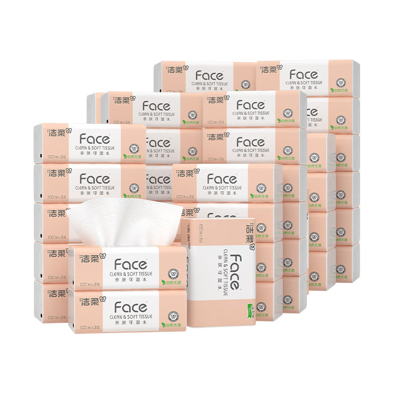 【香菇宠粉节】 洁柔粉face抽纸自然无香可湿水3层100抽48包实惠