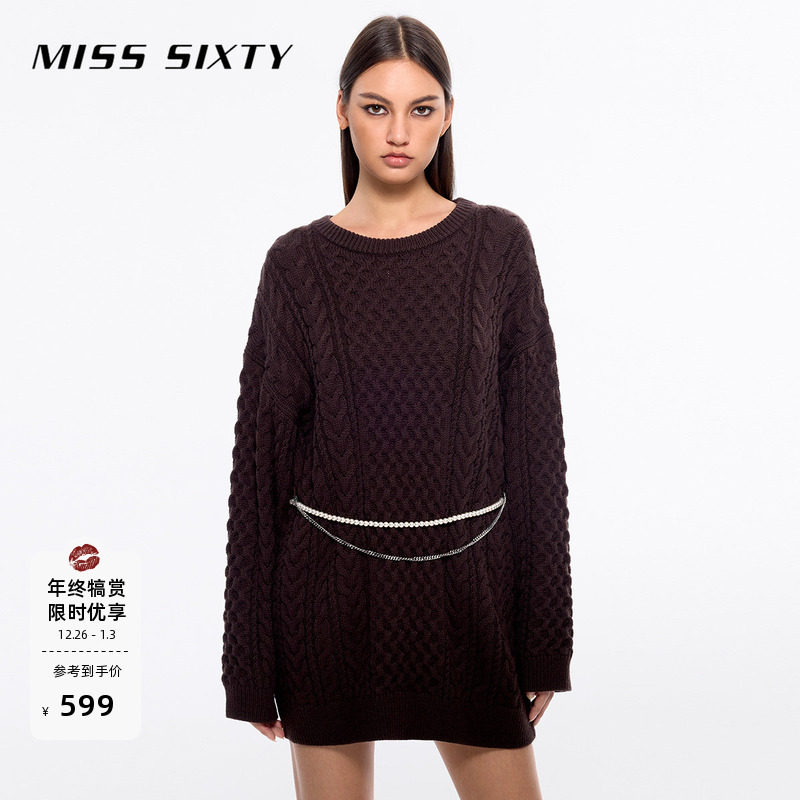 Miss Sixty附腰链羊毛针织衫上衣女圆领宽松长袖中长款两穿毛衣