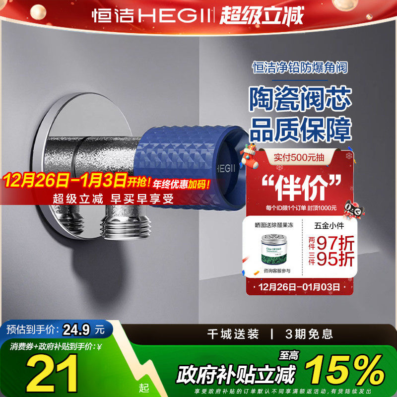 【下拉领补贴】恒洁角阀冷热止水阀门全铜陶瓷健康角阀热水器4分