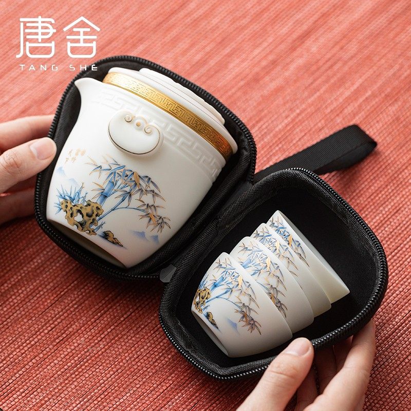唐舍国风羊脂玉瓷旅行茶具套装快客杯一壶四杯高档户外泡茶壶礼品