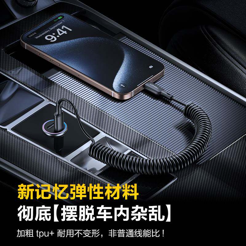 品胜弹簧伸缩数据线carplay车载投屏苹果8-14手机15pro机车互联16车载充电听歌收缩快充线摩托车防水充电线
