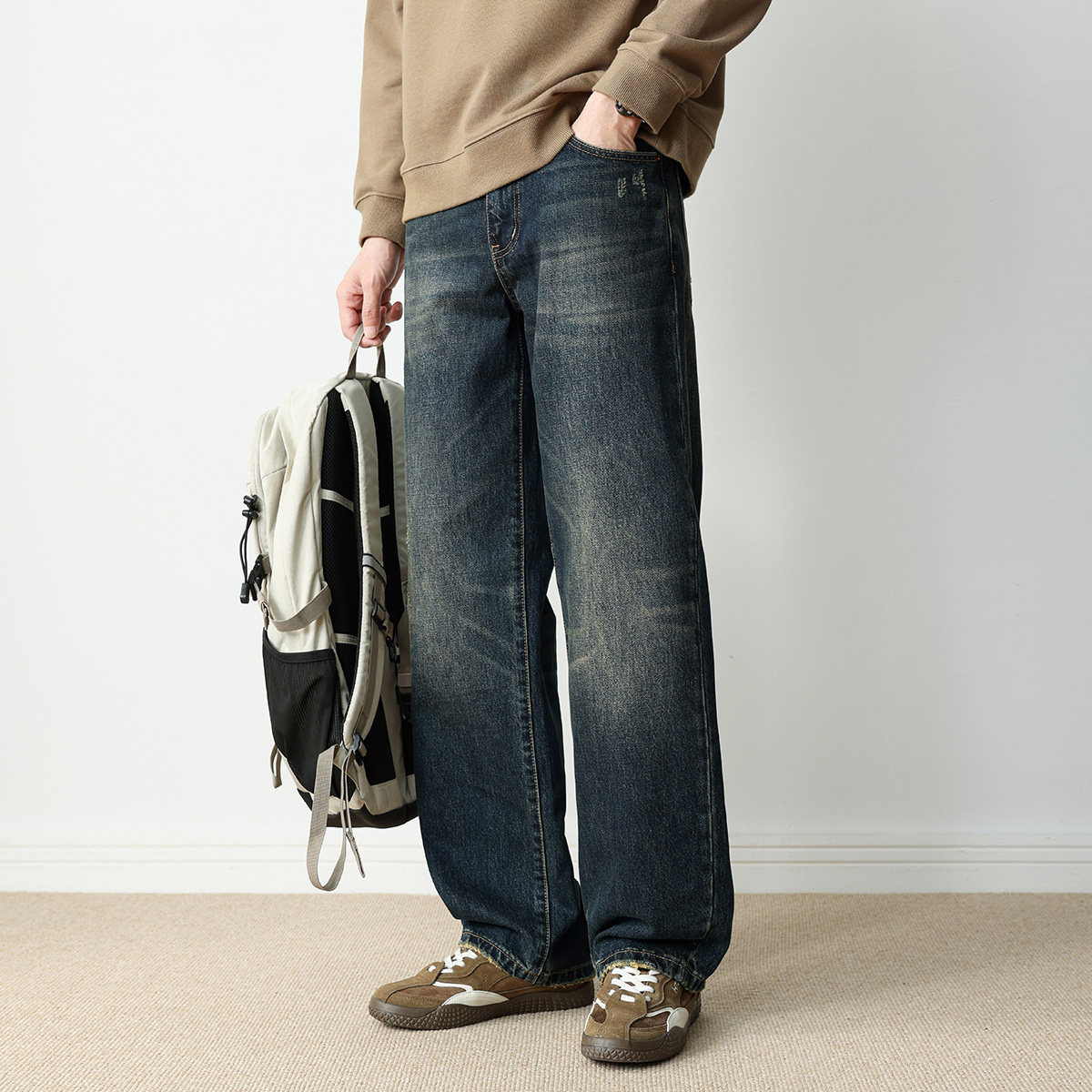 hansca直筒复古深蓝牛仔裤男秋宽松水洗做旧2025秋季阔腿休闲长裤