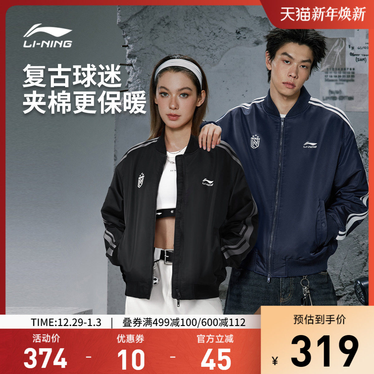 李宁飞行夹克男秋冬2025新款工装宽松棉服保暖棒球服女运动服大衣
