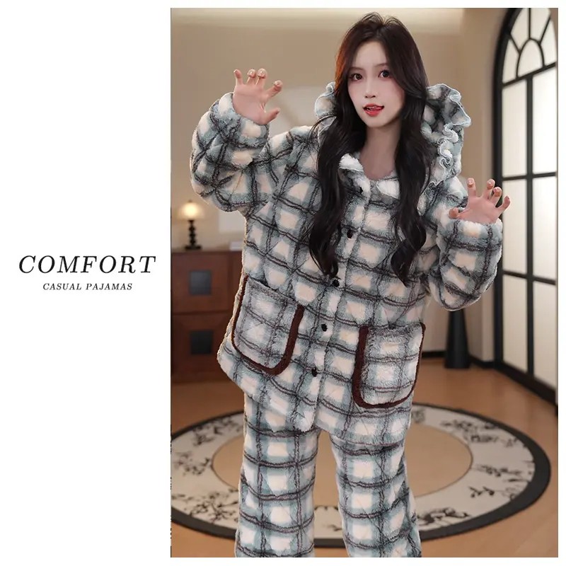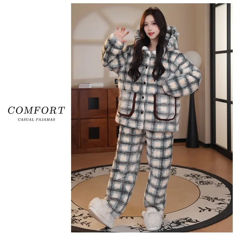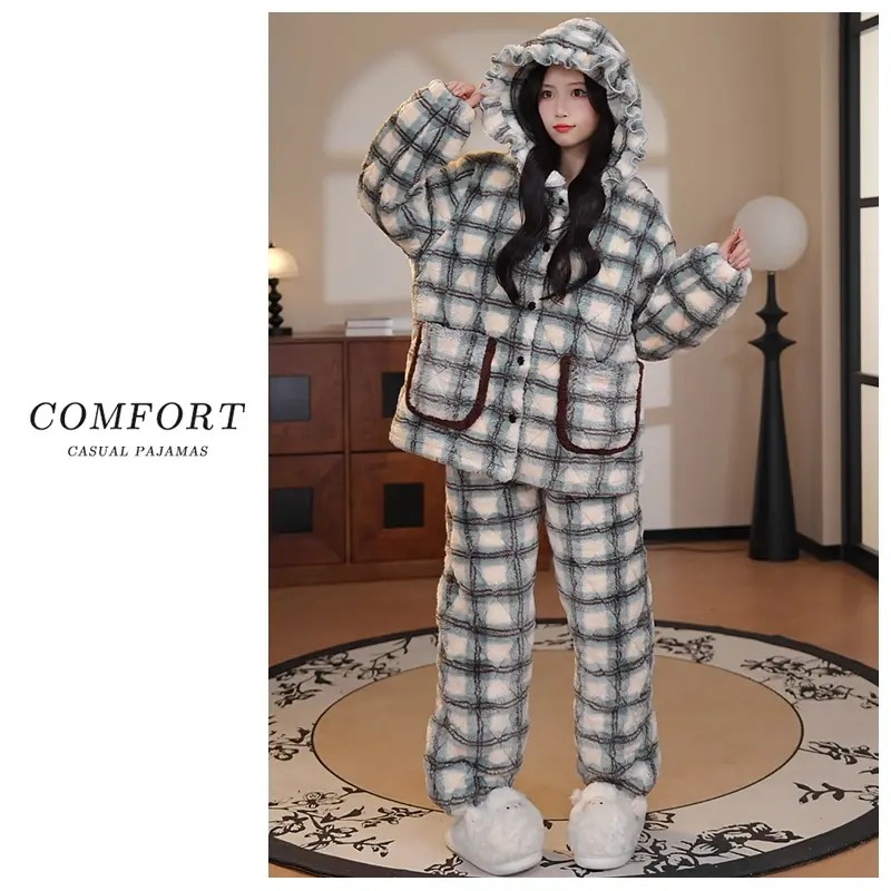 珊瑚绒睡衣女款冬季连帽格子2025新款三层夹棉袄加厚可外穿家居服
