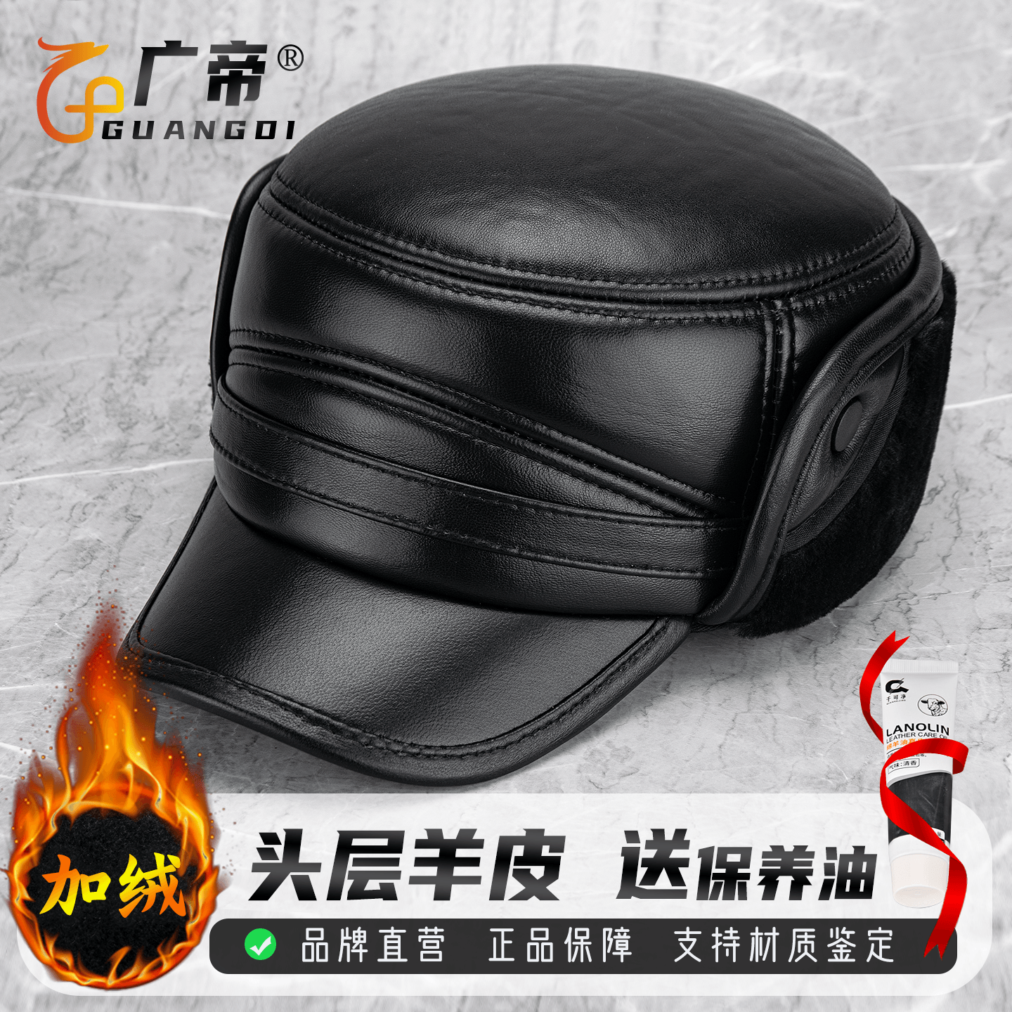 广帝 羊皮 冬季真皮帽子男加绒厚款中老年人保暖鸭舌平顶帽雷锋帽