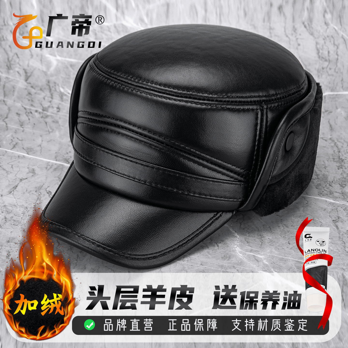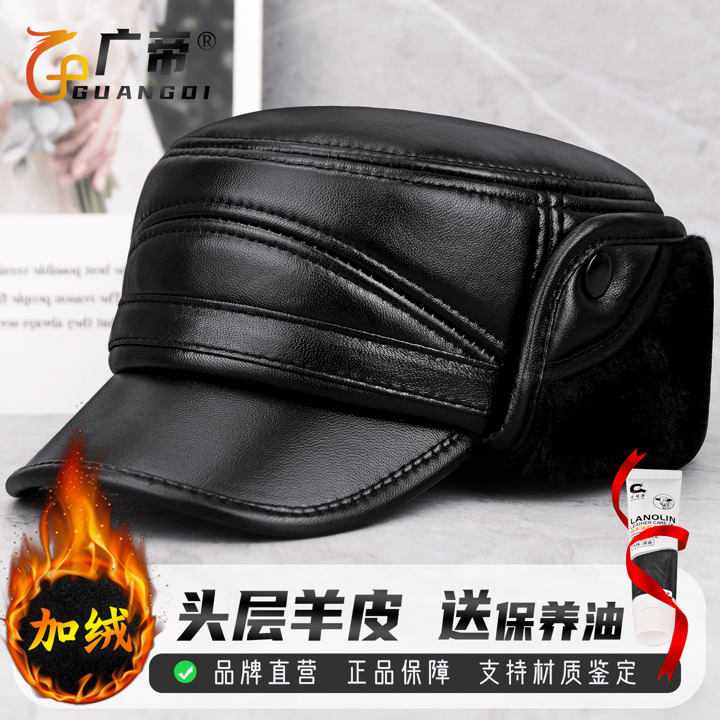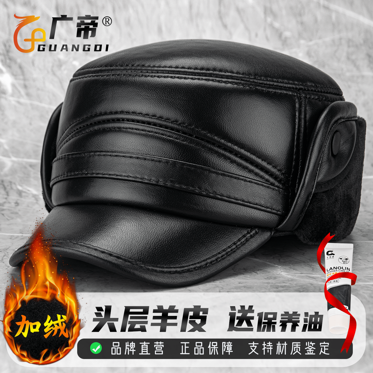 广帝 头层羊皮 男士真皮平顶帽子