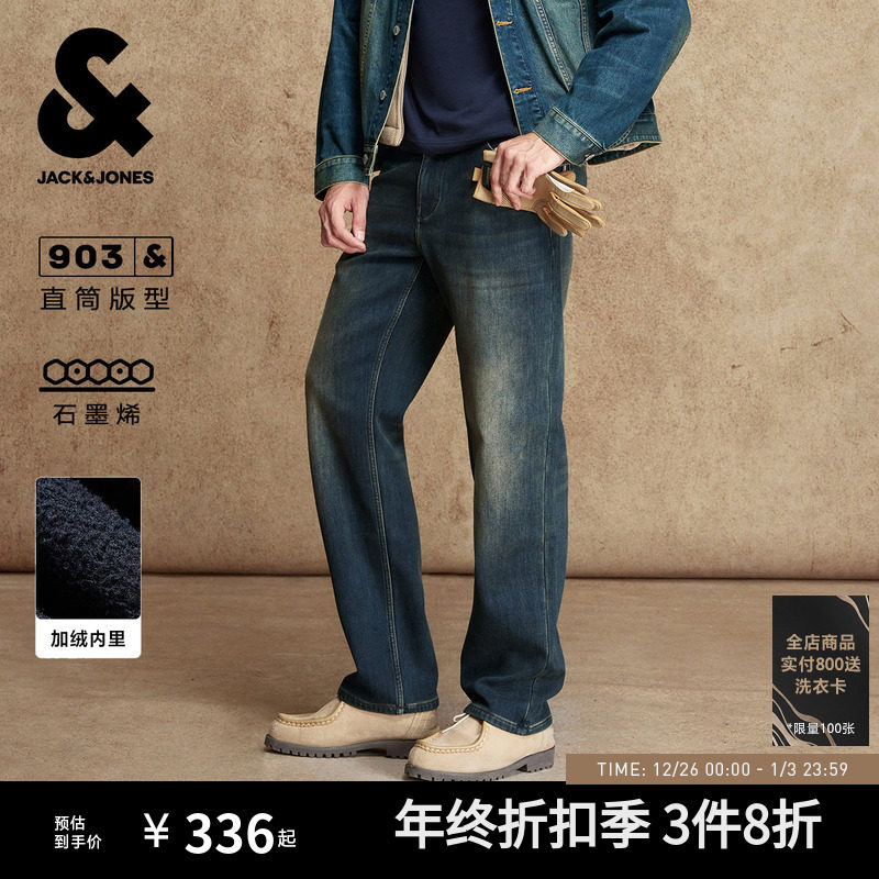903杰克琼斯男装牛仔裤秋冬季做旧水洗加绒宽松直筒长裤子男款