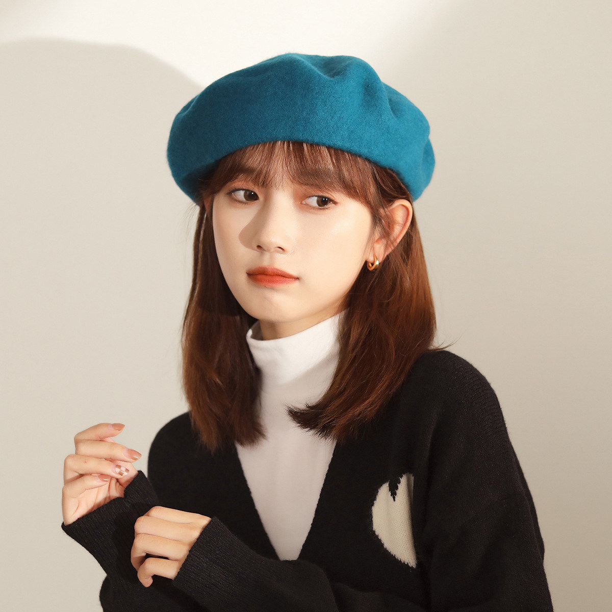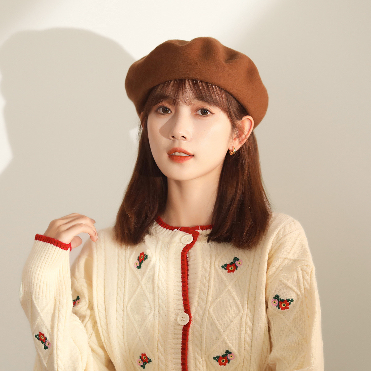 秋冬羊毛贝雷帽女高级感大头围休闲简约帽子白色针织红色黑色防风