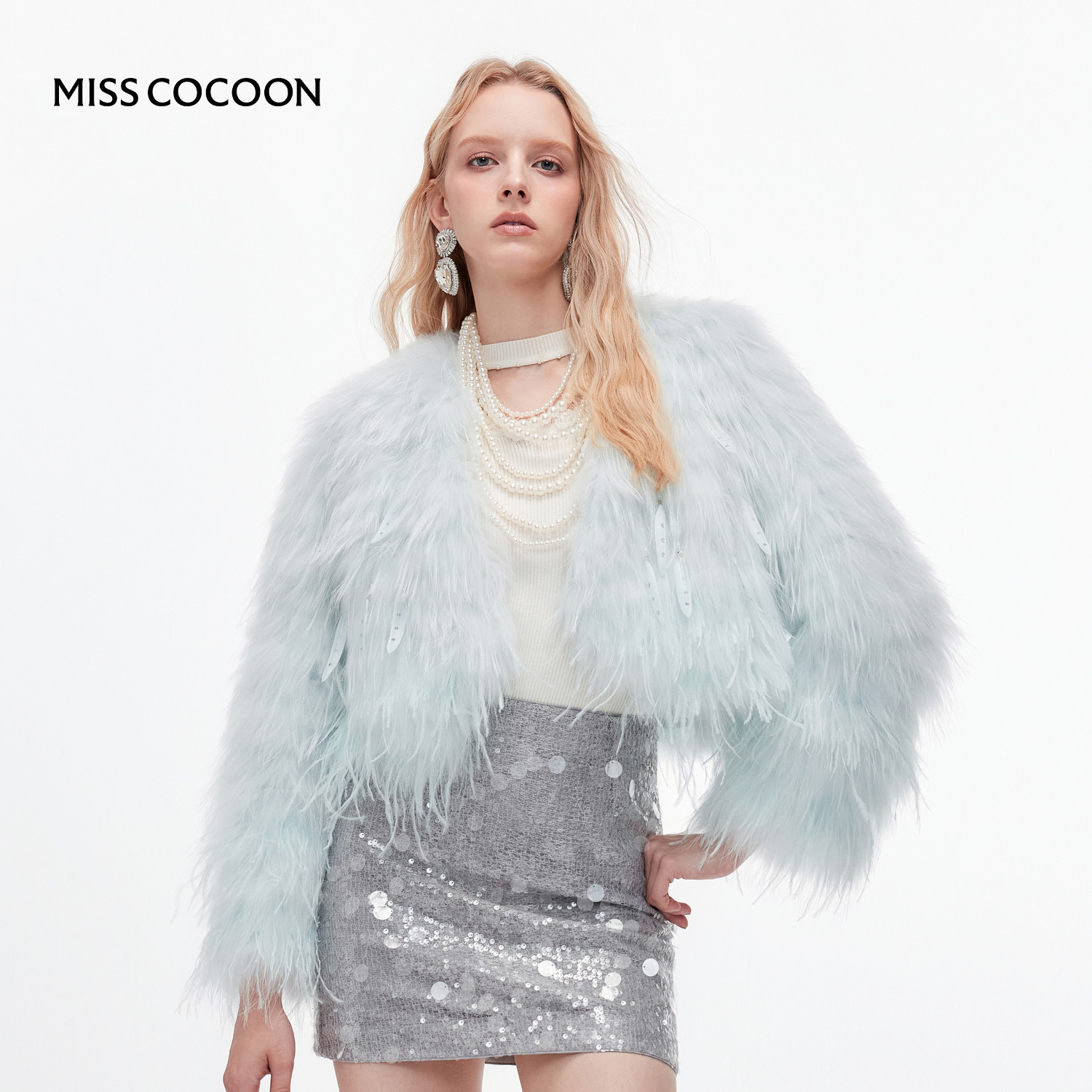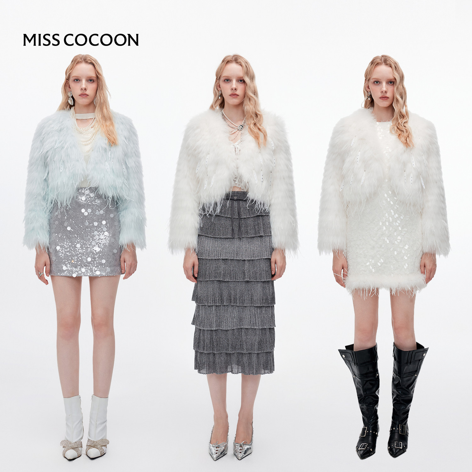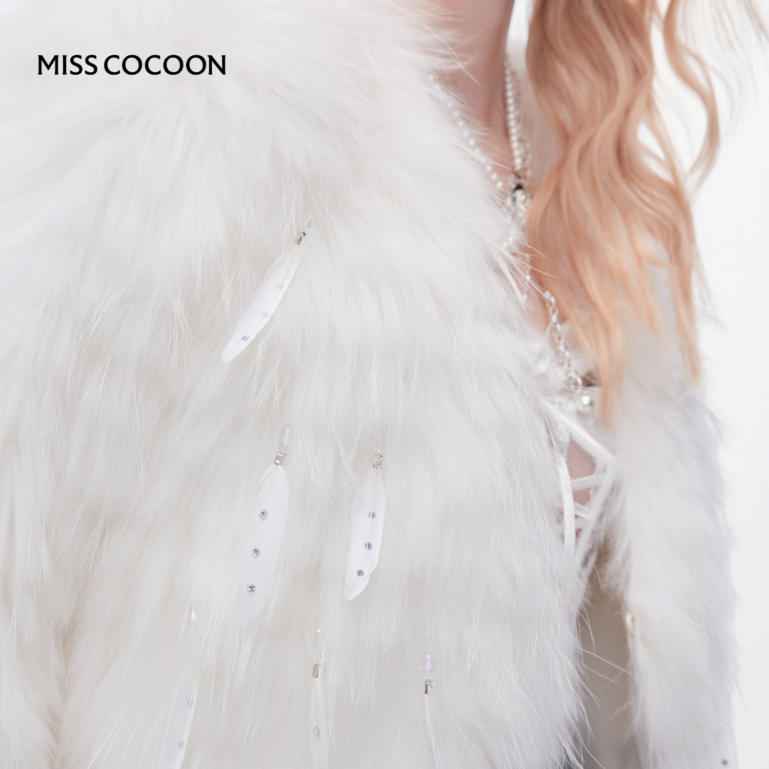 MISSCOCOON可可尼白色短外套女2025冬季新款宽松钉珠貉子毛皮草