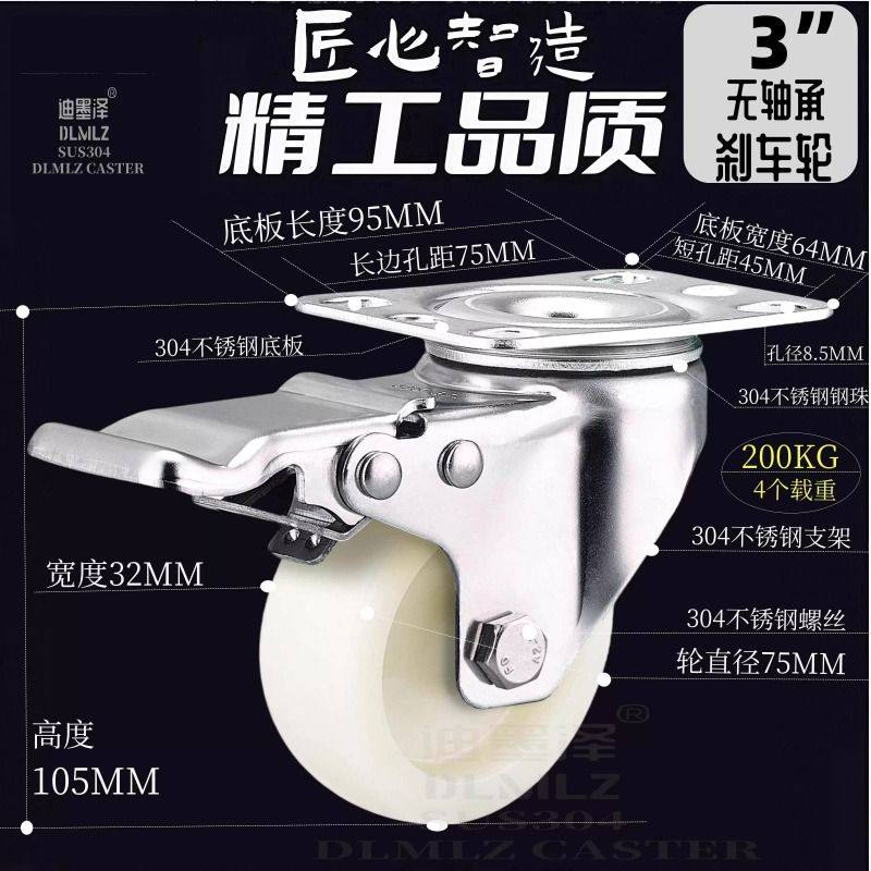 无轴承304不锈钢万向轮脚轮2寸3寸46寸5寸尼龙PP静音特尔灵轴承轮