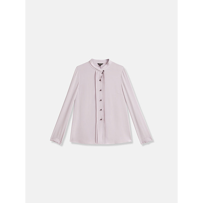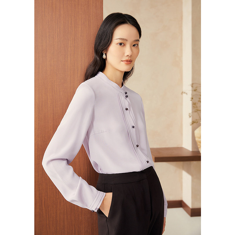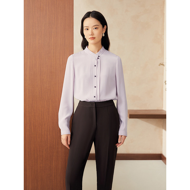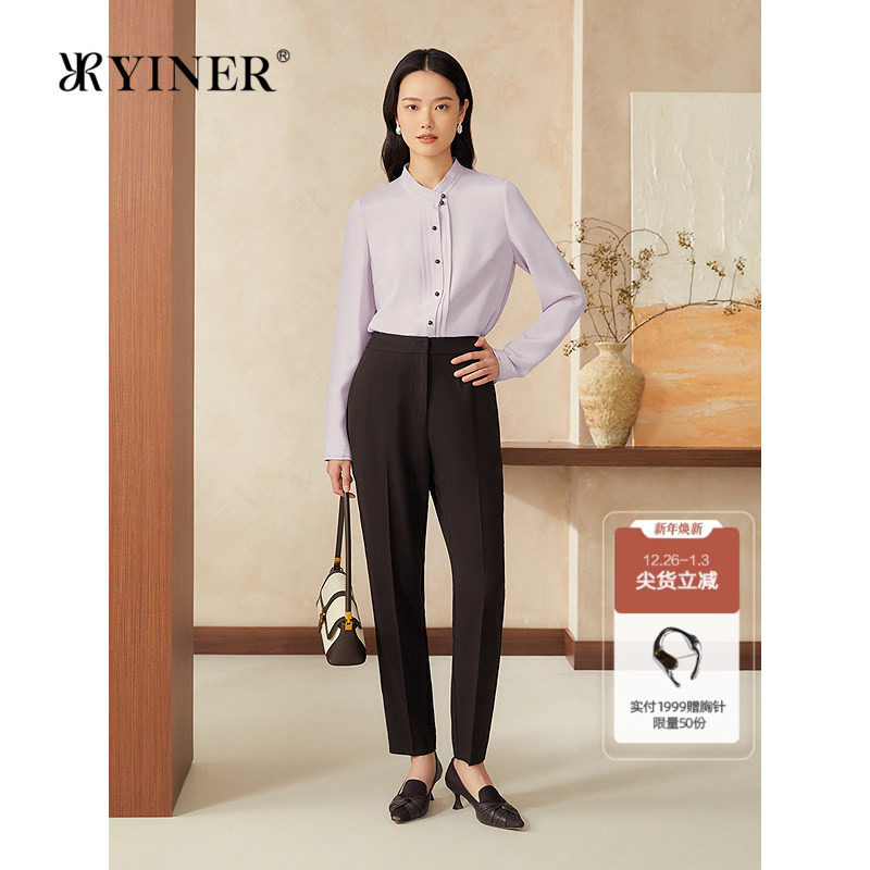 YINER音儿2025春季新款法式时尚皱褶拼接小立领蚕丝混纺衬衫上衣