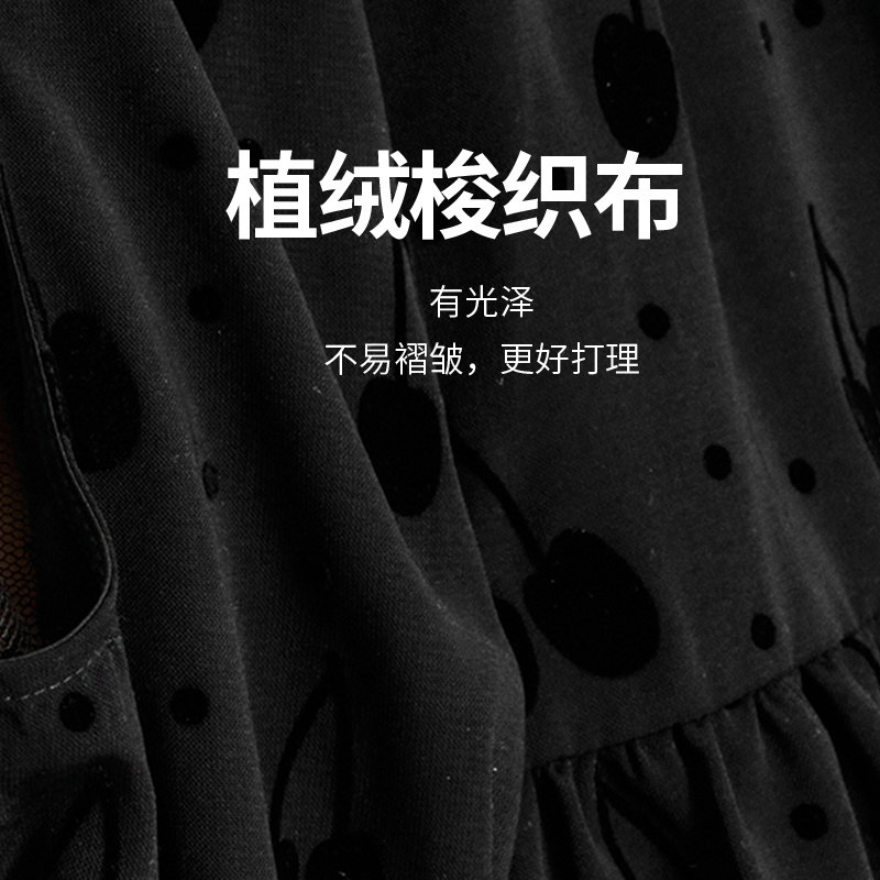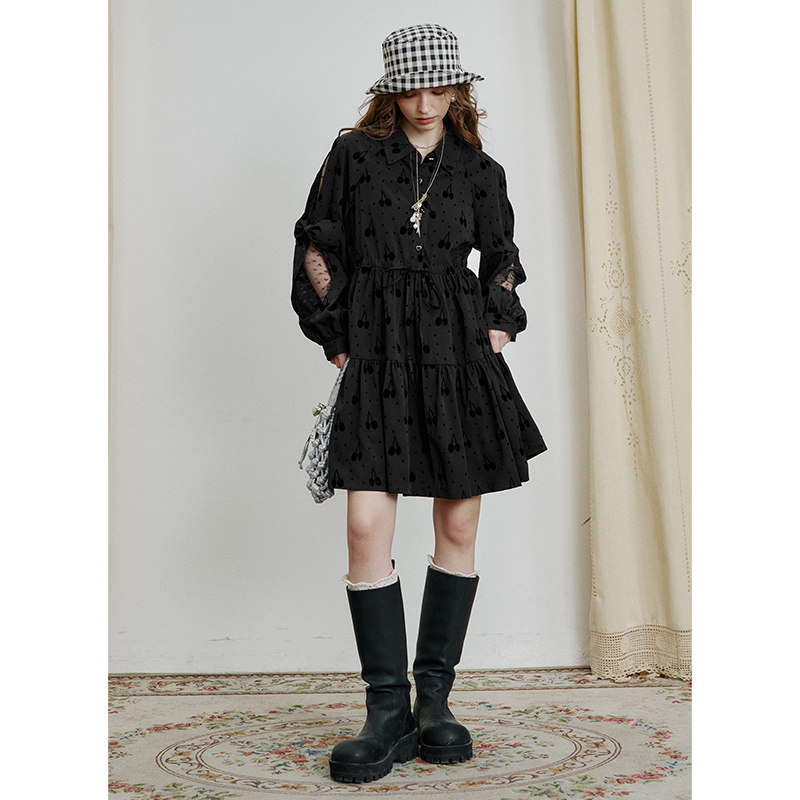 妖精的口袋樱桃黑色网纱连衣裙女2025年春季新款甜美小黑裙衬衫裙