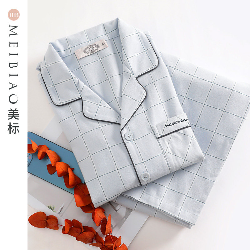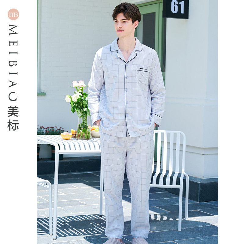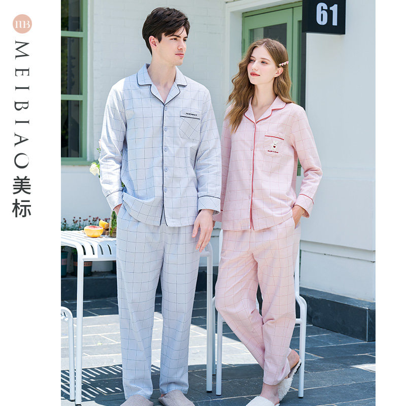 美标新款情侣长袖纯棉睡衣套装春秋休闲格子全棉可外穿家居服男冬