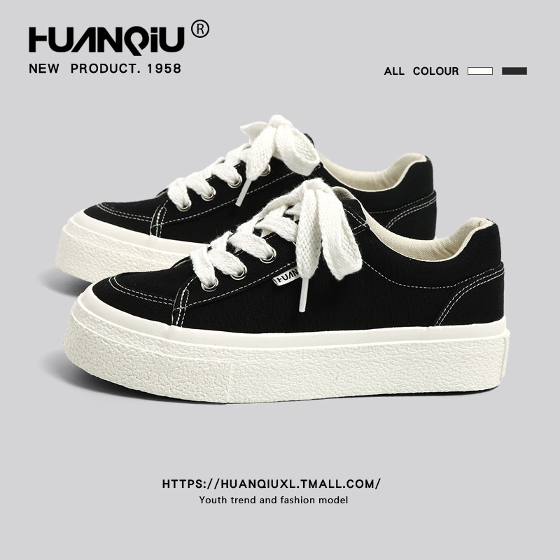 环球厚底黑色帆布鞋女2026年新款春季百搭休闲复古鞋子女运动板鞋