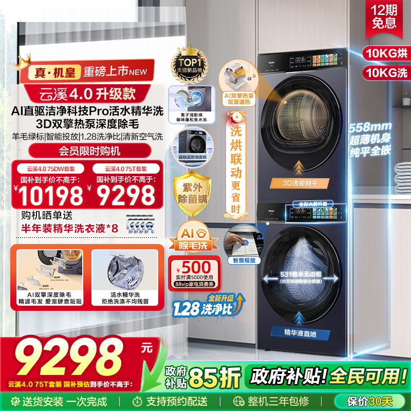 [云溪4.0升级款]海尔洗烘套装双擎热泵洗衣烘干机超薄精华洗pro75