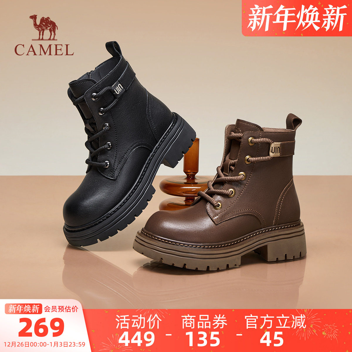 骆驼女鞋2025秋季新款真皮英伦拉链休闲粗跟厚底短靴中筒马丁靴女