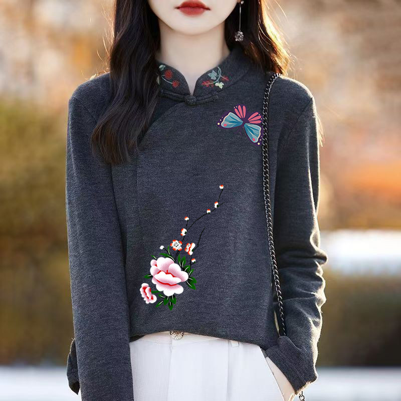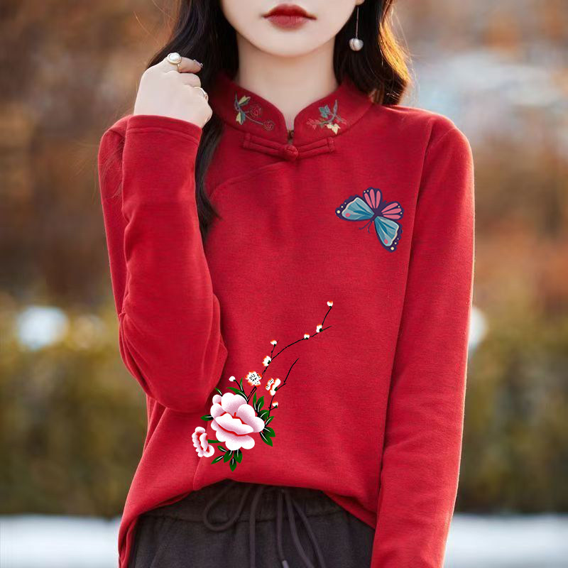 2024秋冬新款双面德绒女士刺绣印花宽松显瘦打底衫国风中式立领