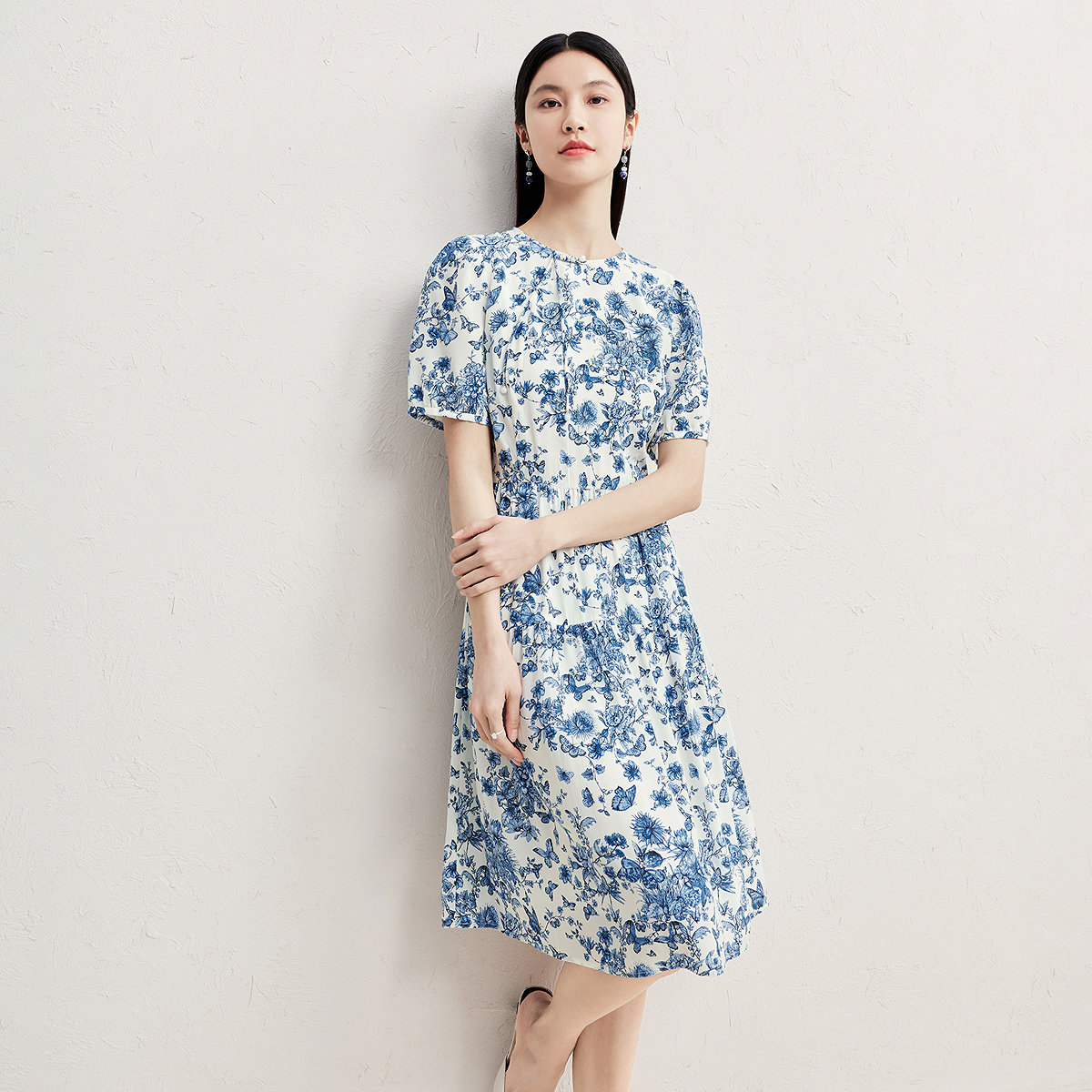 【热销补货】欧时力 褶皱短袖连衣裙女2026春新款收腰显瘦小黑裙