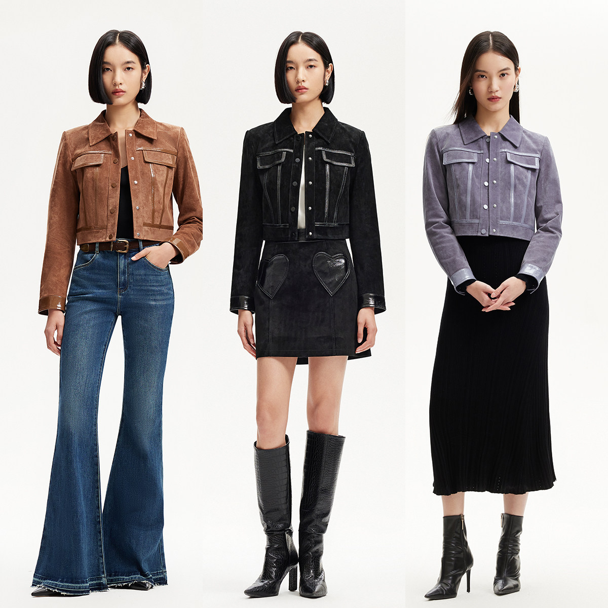 Eland衣恋皮衣女纯色带拉链长袖翻领外套2025冬季新款