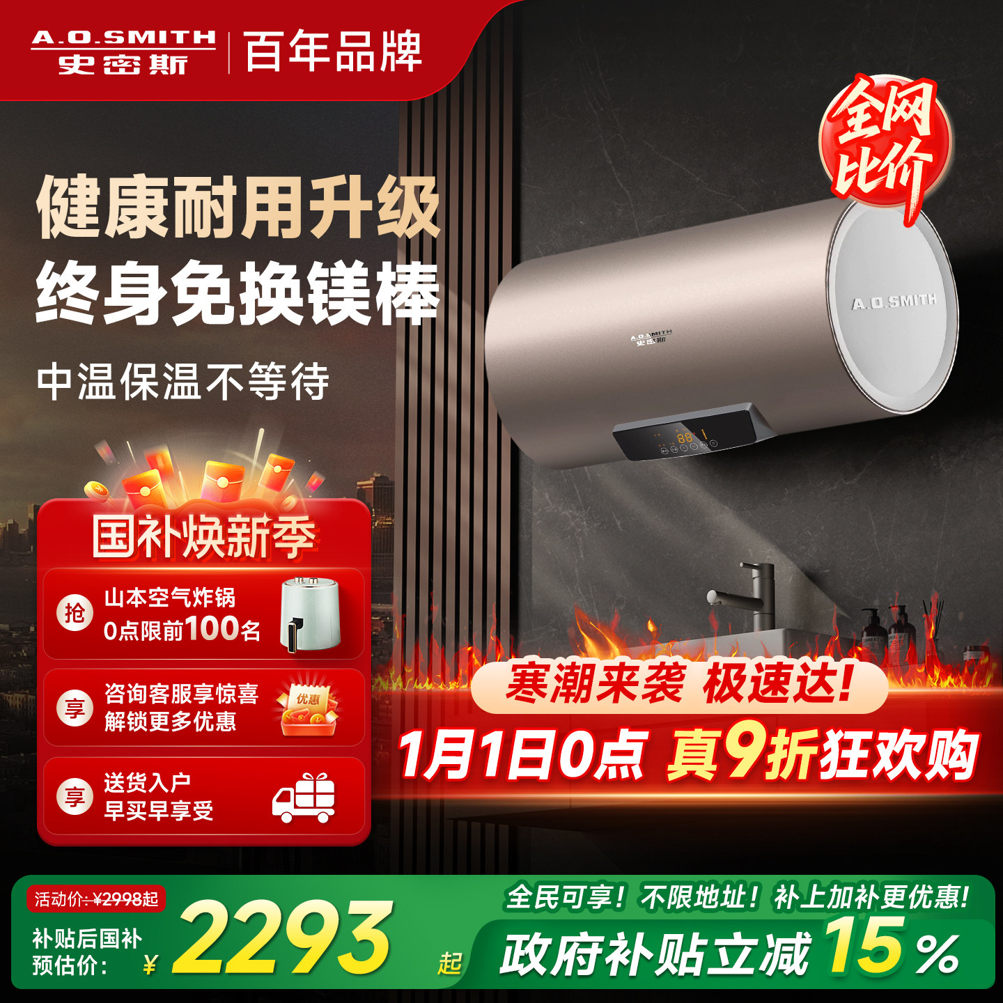 国补AO史密斯电热水器60/80升ED3免换镁棒速热洗澡卫生间一级节能