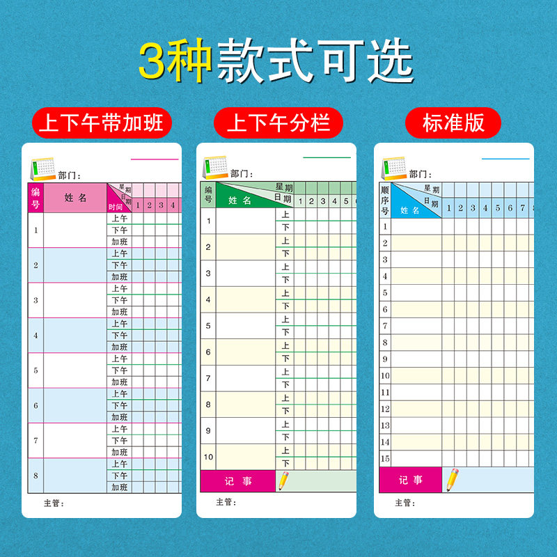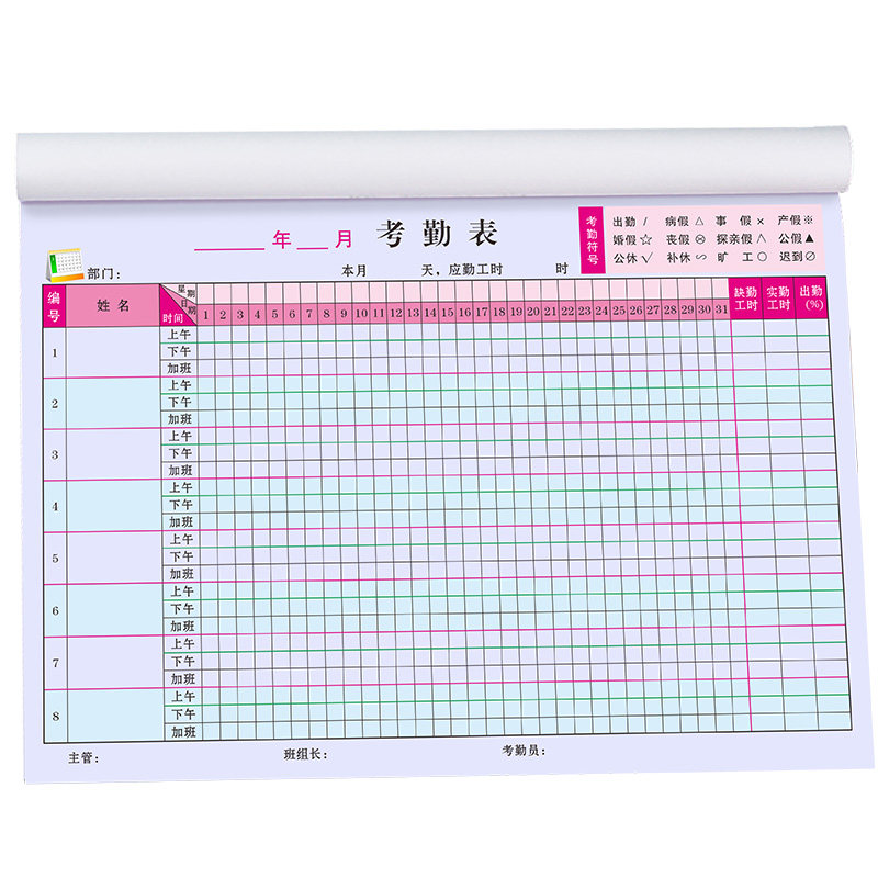 加班考勤表餐饮工资发放单职工绩效考核表工作工天记工本子工时上班记账本公司打卡排班表格薄出勤签到记录本