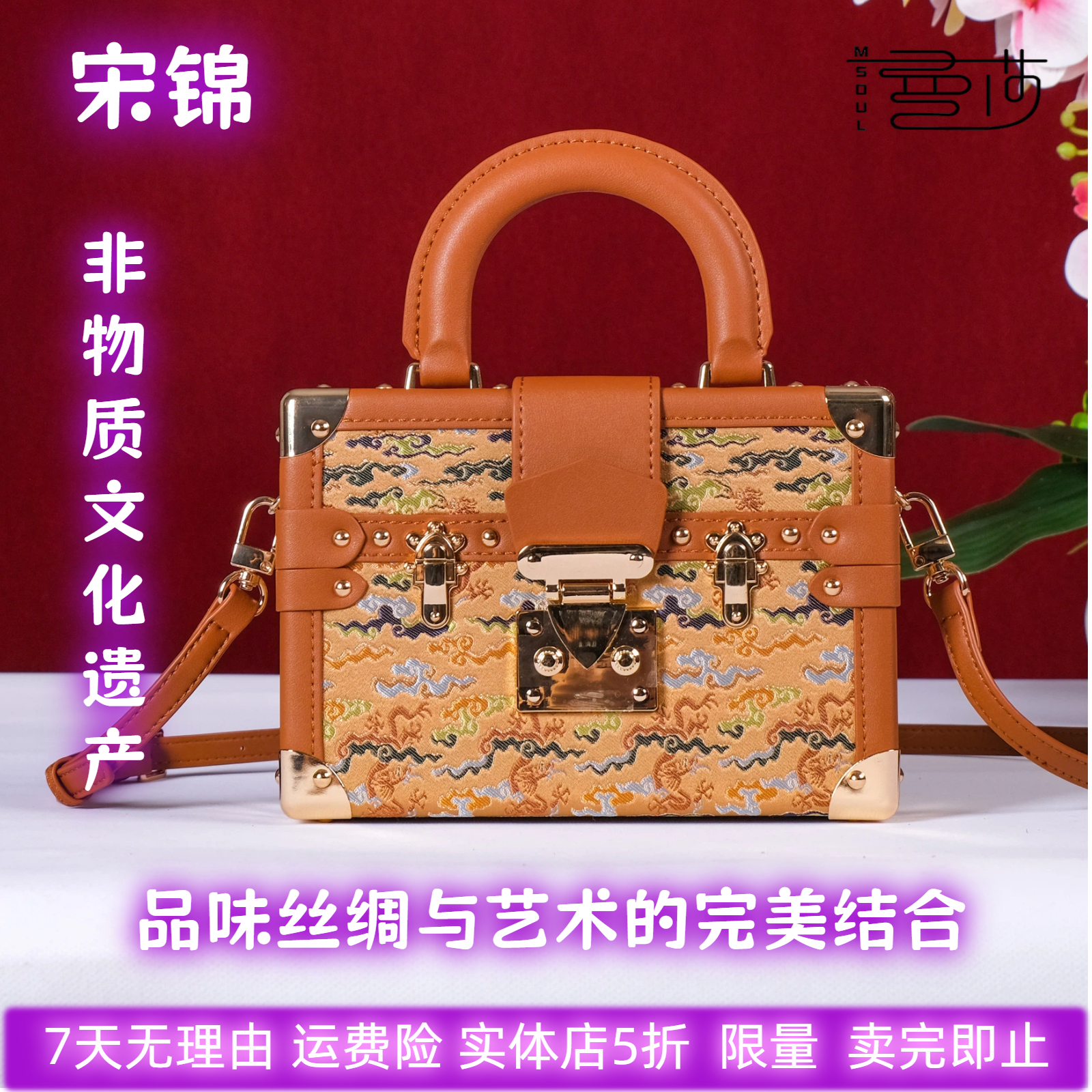 中国风宋锦香云纱手提单肩斜挎绣花真丝真皮