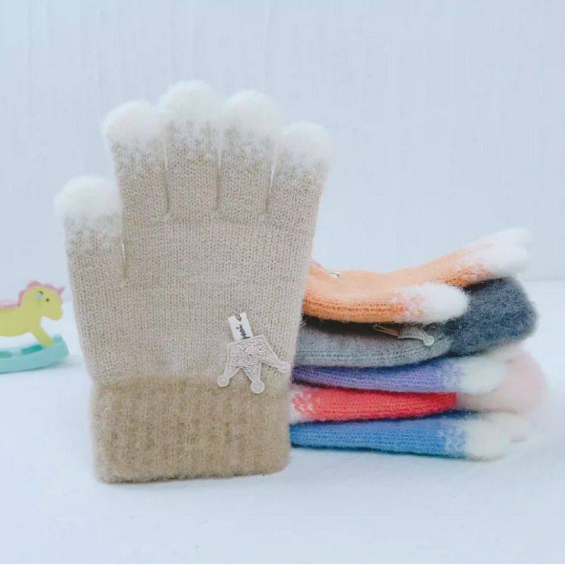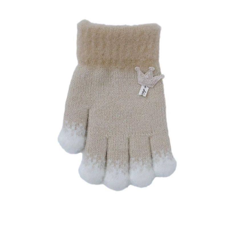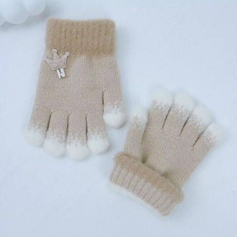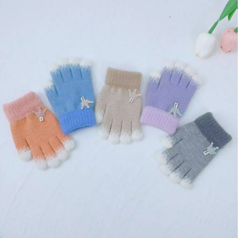 儿童手套秋冬季女童手指套保暖加厚宝宝毛线针织皇冠五指分指手套