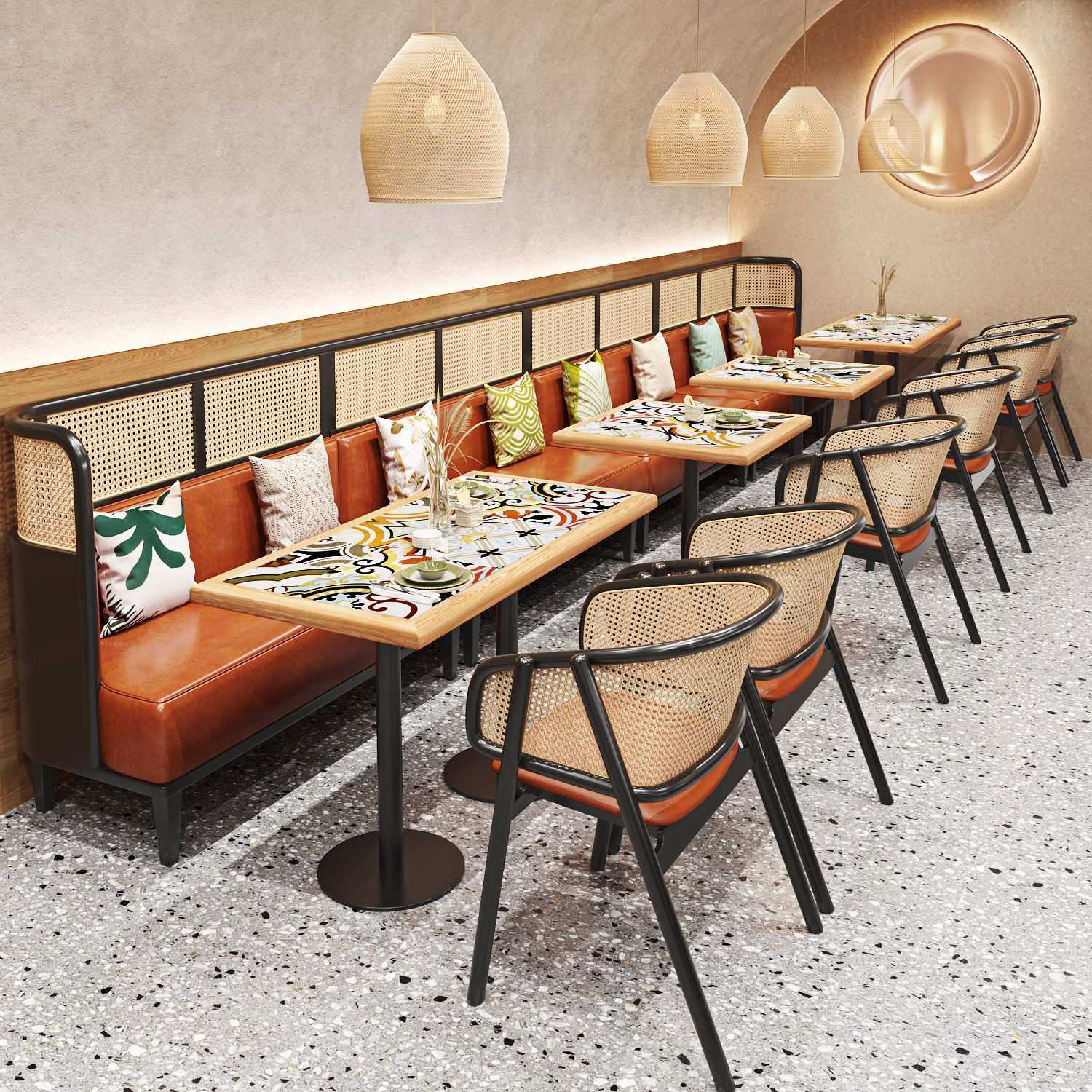 餐厅实木卡座编藤餐椅饭店东南亚咖啡厅家用长桌饭桌餐桌大理石