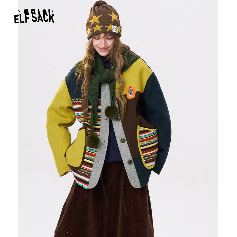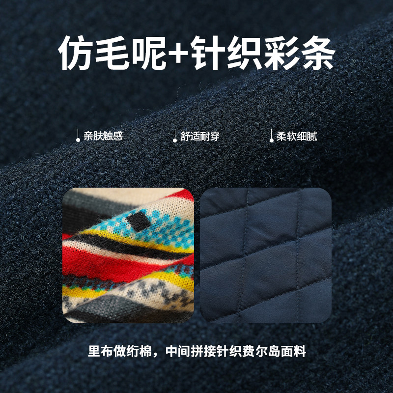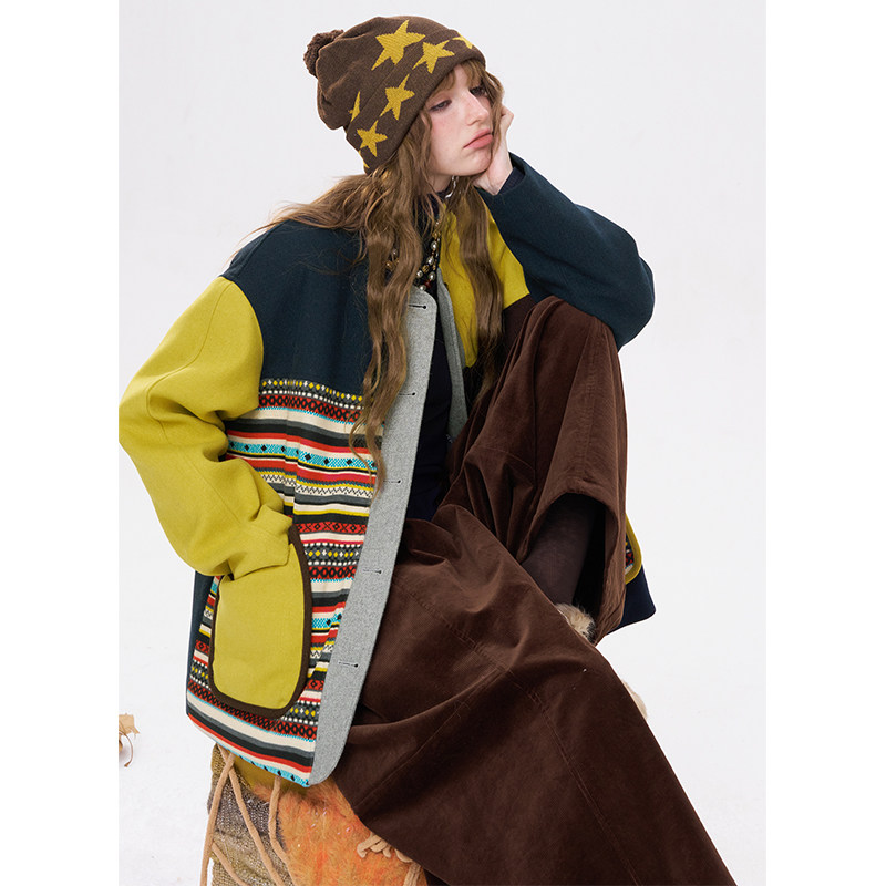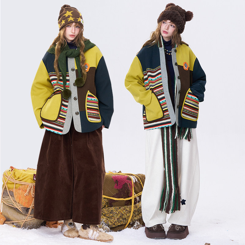 妖精的口袋费尔岛拼接夹棉短款仿毛呢外套女2025冬季新款加厚休闲