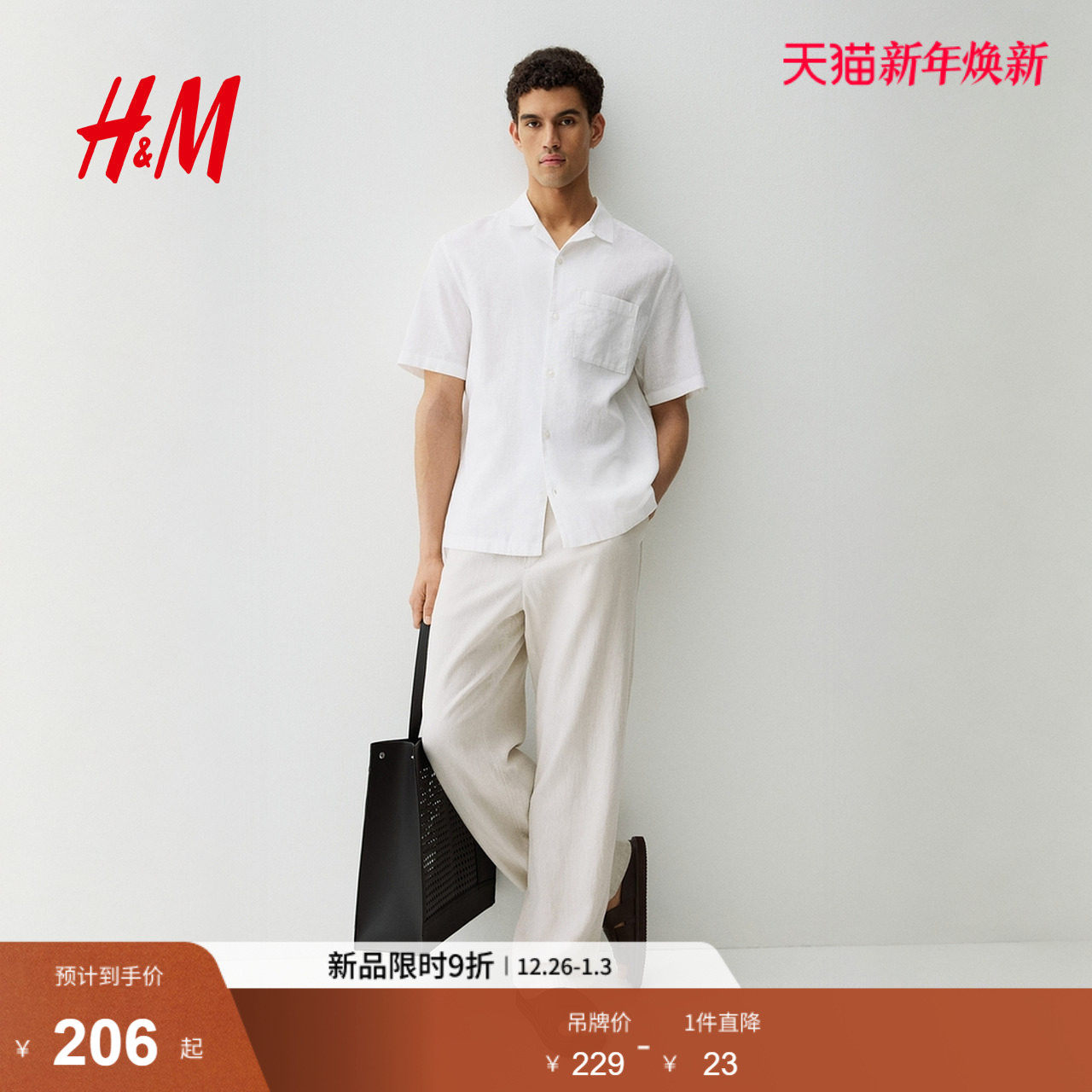 HM男装古巴领衬衫2025冬季新款潮流通勤亚麻混纺短袖衬衣1256946