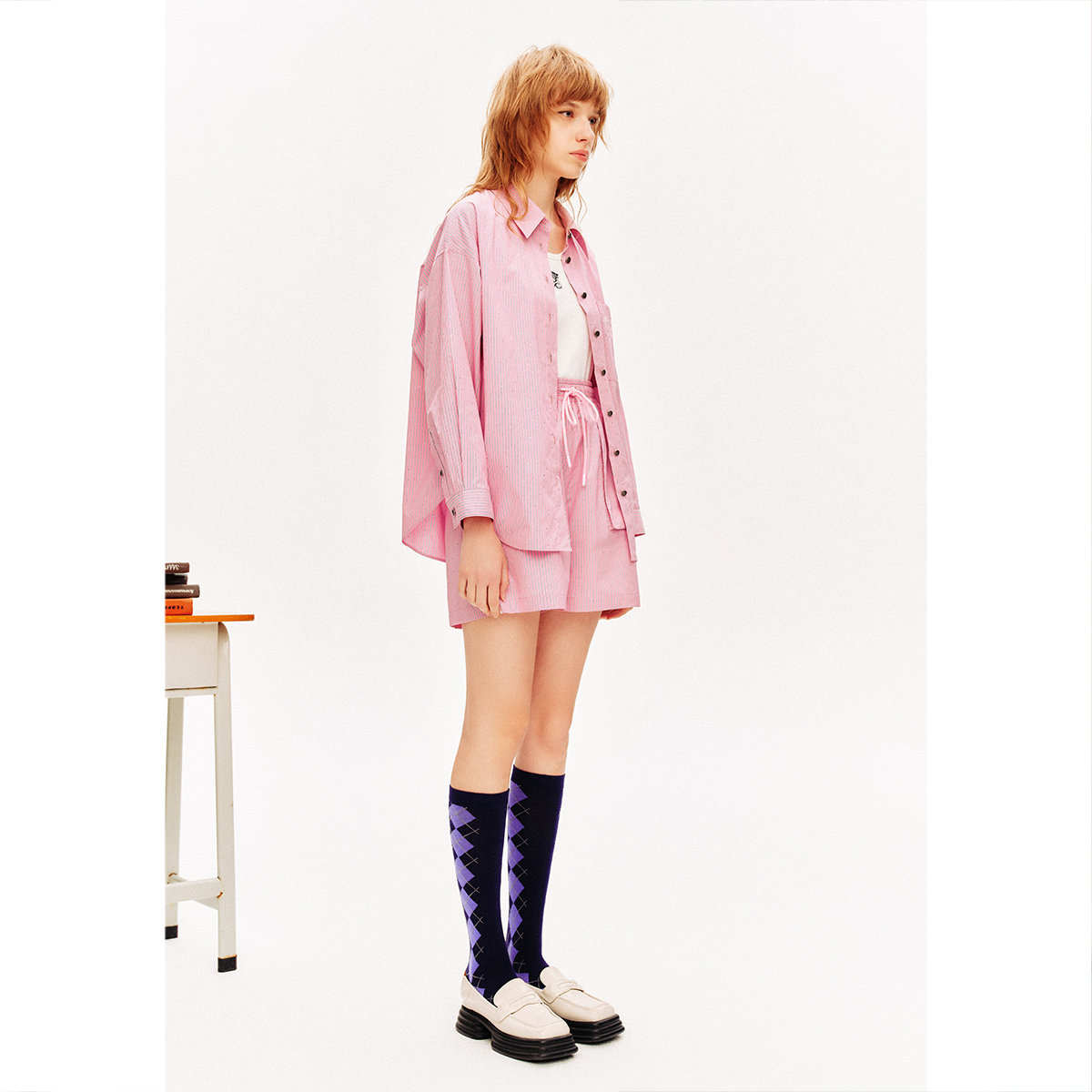 森马长袖衬衫女冬季菱形格V领短背心易打理衬衣俏皮学院风两件套